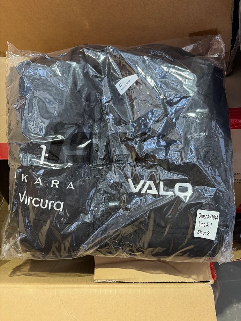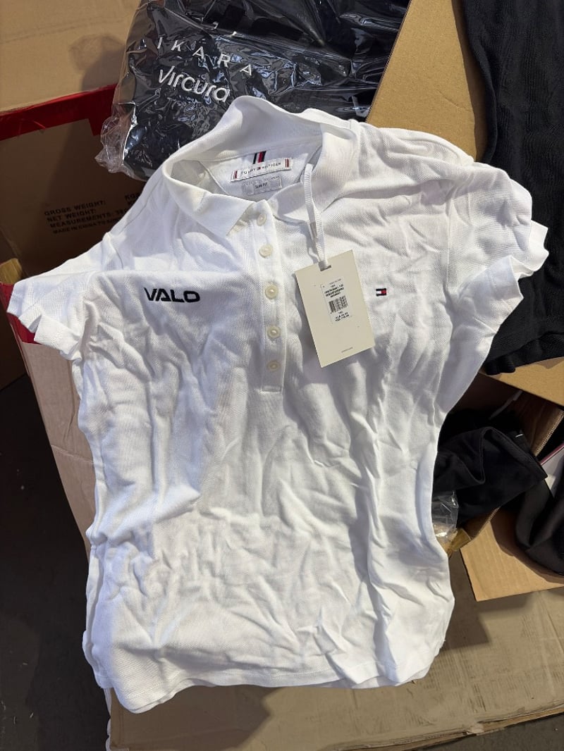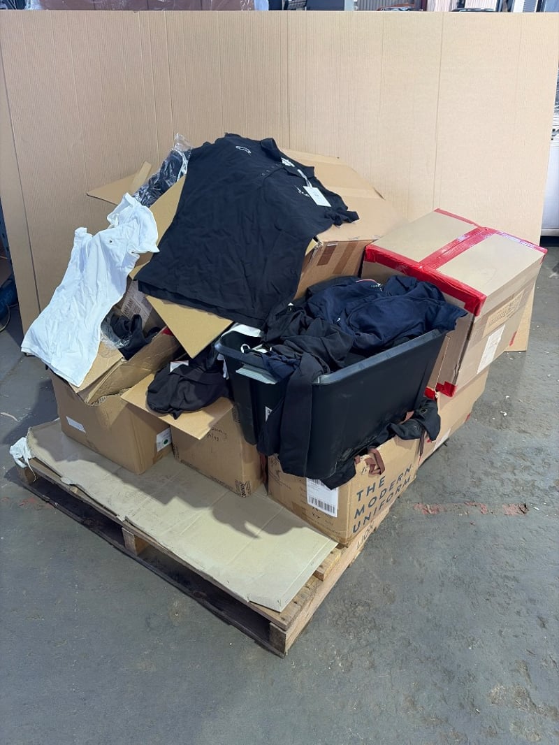 Bulk wholesale clothing lot comprising approximately 50+ garments in mixed styles and sizes. Inventory includes black polo shirts, white polo shirts (VALO branded), black t-shirts, and assorted apparel from brands including Tommy Hilfiger & much more. Stock is packaged in cardboard boxes on wooden pallets with plastic wrapping. Mix of new with tags and pre-owned items. Suitable for retail resale, online commerce, or wholesale distribution. Ideal for clothing retailers, market traders, or bulk buyers seeking mixed branded inventory.