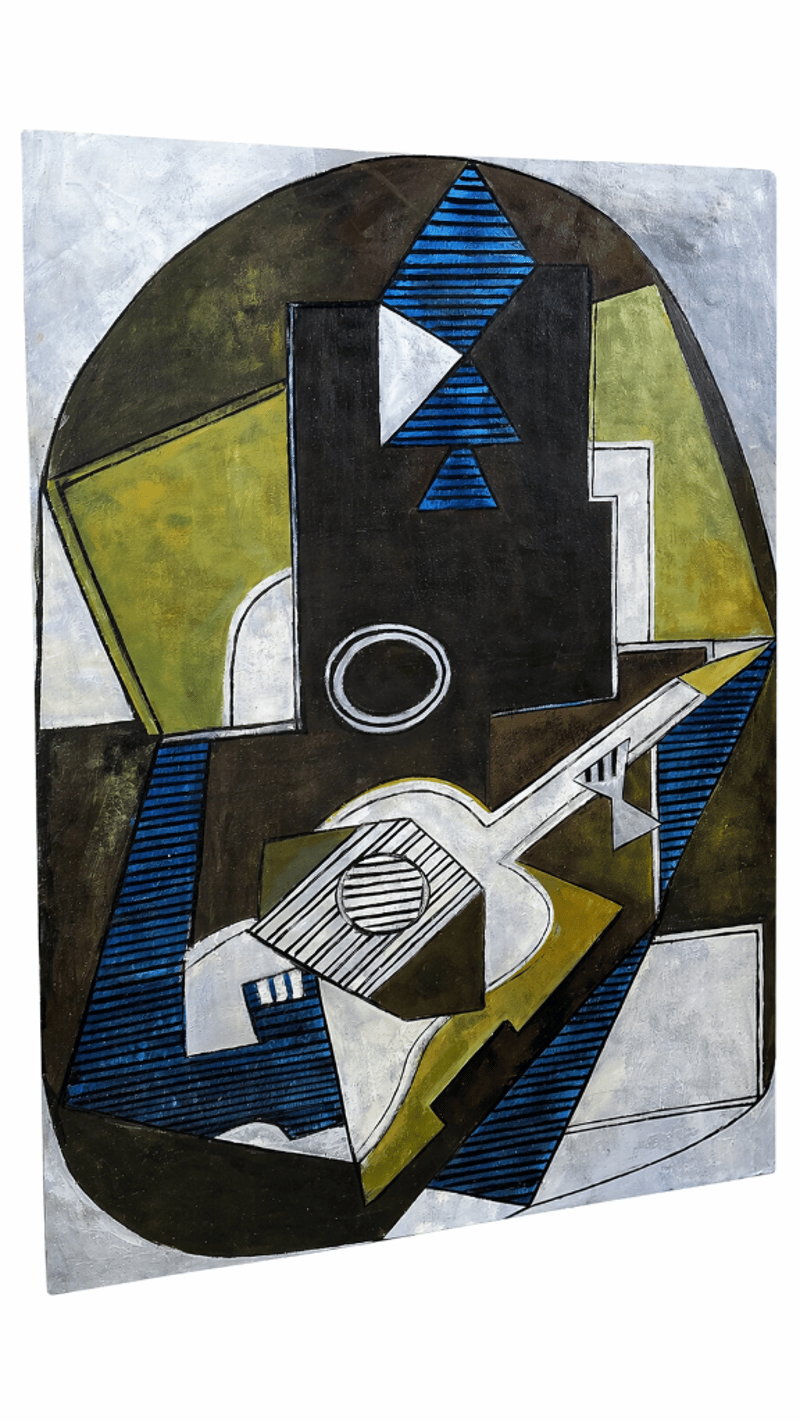 Striking modernist artwork featuring a stylized cubist composition with geometric abstraction. The piece depicts a fragmented figure or head rendered in bold, angular forms with a prominent guitar motif. The palette comprises deep blacks, vibrant blues with horizontal striations, olive and chartreuse yellows, whites, and grey tones. Central elements include stacked triangular shapes, circular forms suggesting eyes, and a detailed guitar rendered in white with linear detailing. The composition demonstrates sophisticated use of overlapping planes and contrasting textures, characteristic of early-to-mid 20th century modernist painting. The work exhibits strong cubist influences with dynamic spatial relationships and a balanced interplay between representational and abstract elements.