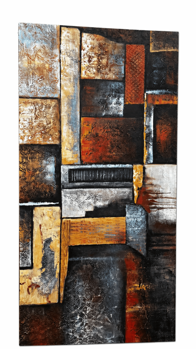 Contemporary abstract mixed media artwork featuring a geometric composition of rectangular blocks in layered earth tones and industrial hues. The piece showcases a sophisticated palette of rust reds, burnt oranges, charcoal blacks, cream whites, and golden yellows with distressed texturing throughout. Each rectangular segment displays varied surface treatments including weathered finishes, metallic accents, and tactile impasto elements that create dimensional depth. The composition employs a structured grid-like arrangement with deliberate color blocking and tonal variation, suggesting themes of urban decay, industrial landscapes, or architectural abstraction. The artwork demonstrates skilled execution in mixed media technique with visible brushwork and layered applications creating visual interest and movement across the surface.