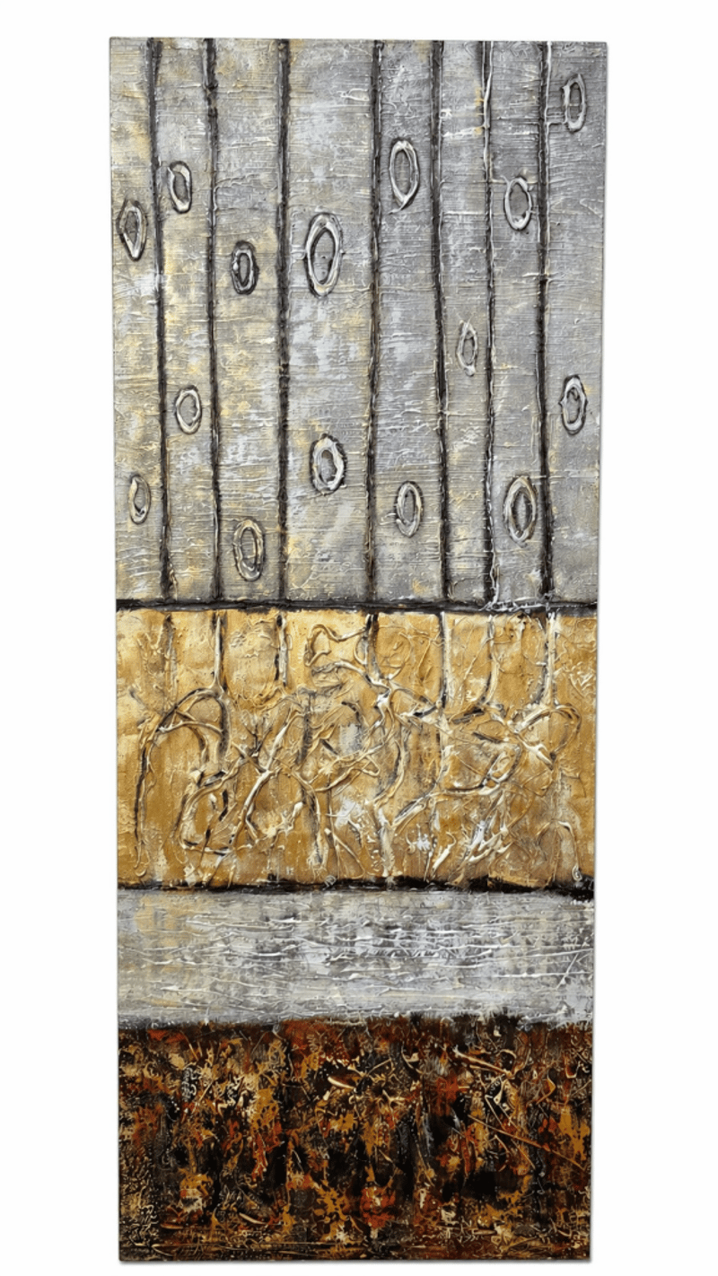 Abstract mixed-media artwork featuring three distinct horizontal sections. Upper section displays vertical wooden planks with circular knot patterns in grey and weathered tones. Middle section showcases textured golden-brown relief surface with organic, gestural mark-making. Lower section comprises a narrow grey band above a rust-oxidized base with deep textural scoring and patina. The composition demonstrates skilled layering of materials and techniques, creating visual depth through contrasting surfaces and tonal variations. Suitable for contemporary or industrial interior settings.