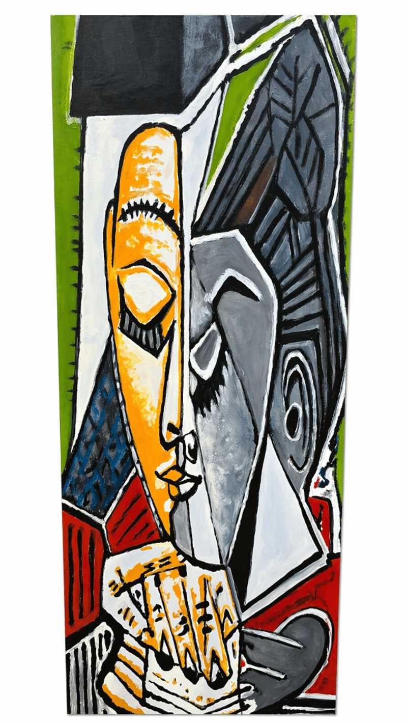 Contemporary abstract acrylic painting on canvas featuring bold geometric composition with expressionist elements. The work showcases a fragmented figure rendered in vibrant orange, yellow, and cream tones contrasted against charcoal grey and black angular forms. Dynamic white linear outlines define the composition, creating sharp divisions between planes. The palette includes striking primary colours—red, blue, and yellow—integrated throughout the layered design. The painting demonstrates confident brushwork with textured surface application, characteristic of modern street art or graffiti-influenced fine art. The composition suggests cubist-inspired deconstruction with energetic, gestural mark-making. Bright lime green background provides luminous contrast to the darker central motif.