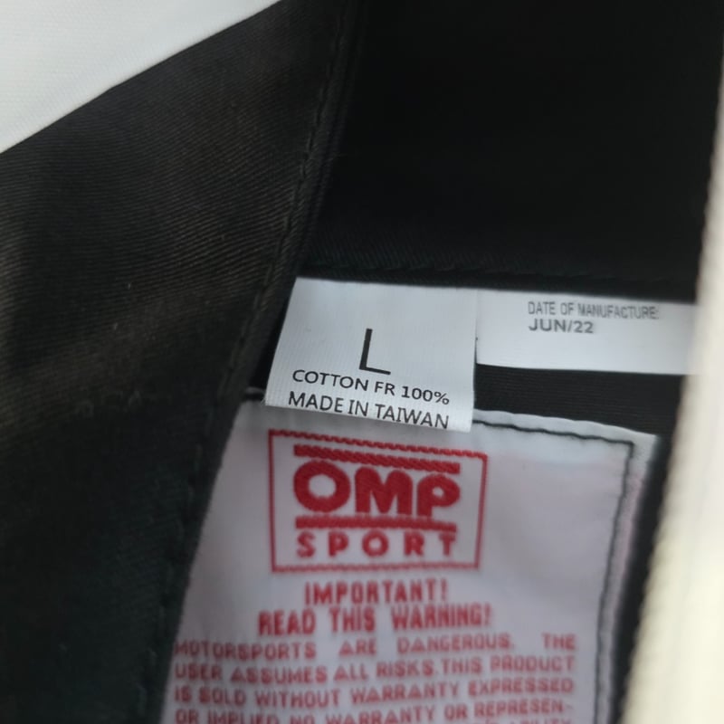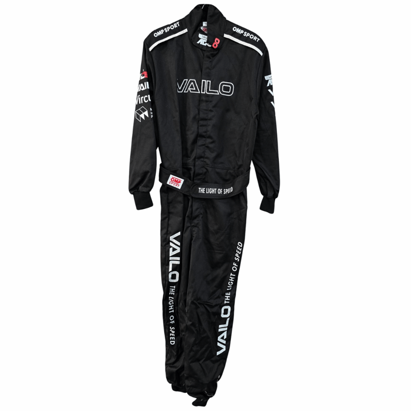 Professional motorsport racing suit by VAILO featuring OMP Sport branding. Black nylon construction with white contrast piping on shoulders and sleeves. Front chest displays "VAILO" text with additional sponsor logos including "Vircura" branding on left sleeve. Waist features elasticated gathering with "THE LIGHT OF SPEED" tagline and OMP branding. Full-length legs with "VAILO" text running down outer seams. Back panel displays "VAILO ADL500" branding in white and red Size L Bid per each must take 1