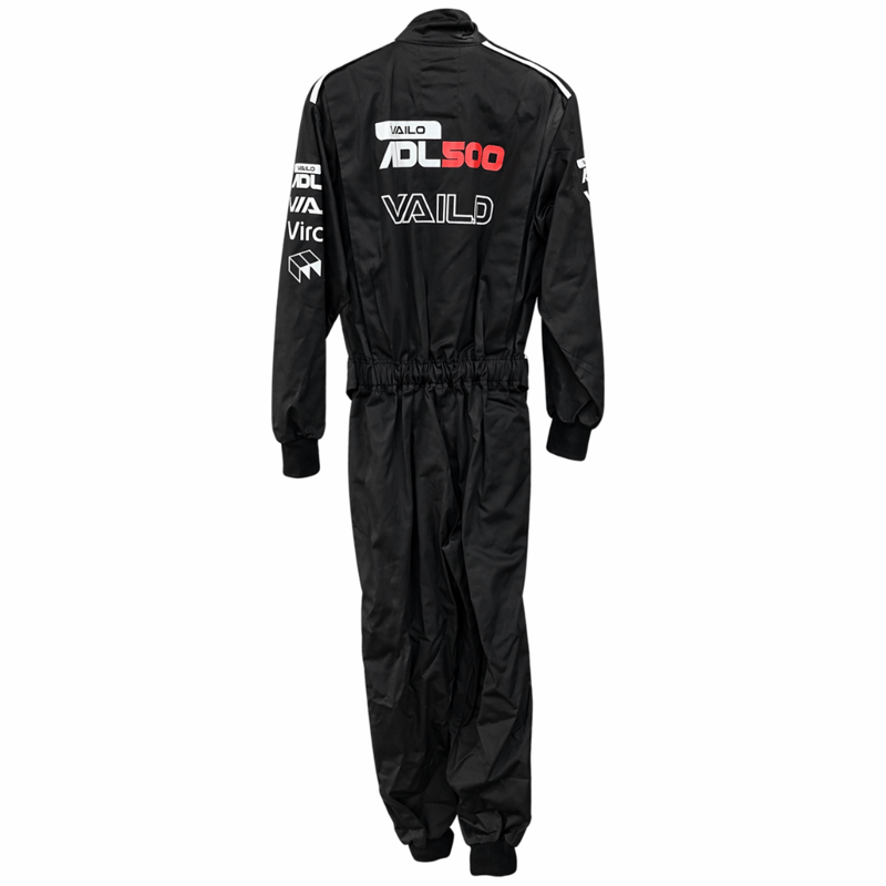 Professional motorsport racing suit by VAILO featuring OMP Sport branding. Black nylon construction with white contrast piping on shoulders and sleeves. Front chest displays "VAILO" text with additional sponsor logos including "Vircura" branding on left sleeve. Waist features elasticated gathering with "THE LIGHT OF SPEED" tagline and OMP branding. Full-length legs with "VAILO" text running down outer seams. Back panel displays "VAILO ADL500" branding in white and red
