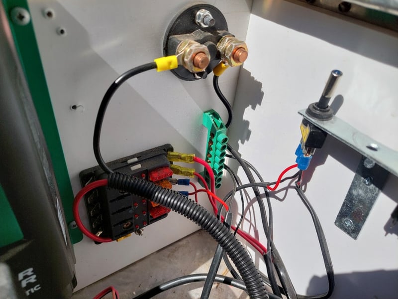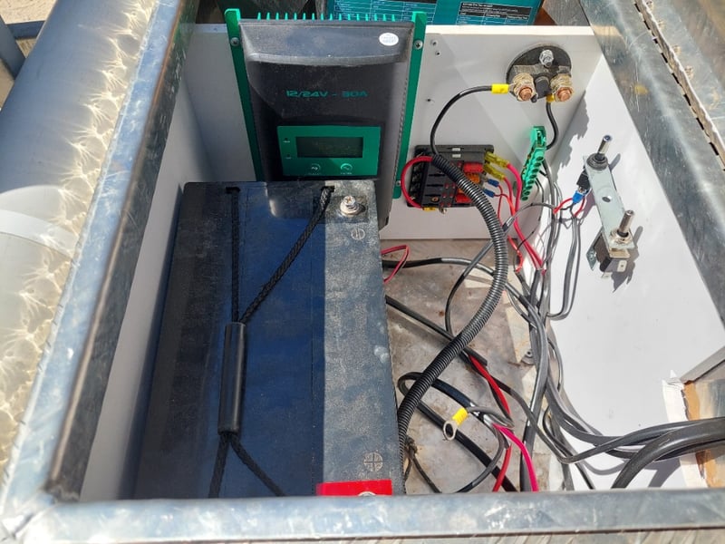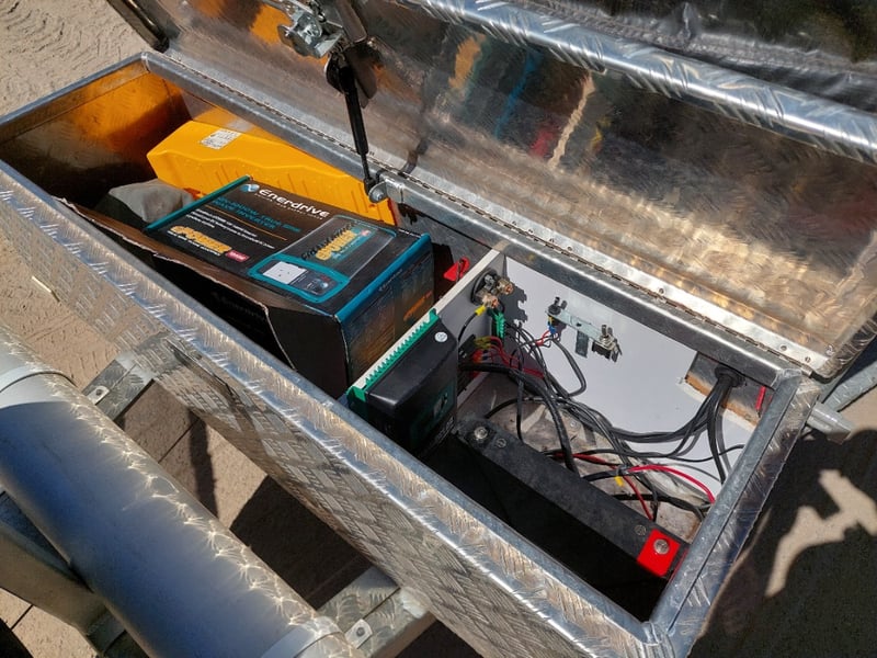 Battery system running through enerdrive solar regulator and run throughout trailer with ciggy and Anderson plugs to run lights and phone charges etc