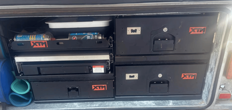 4x Xtm drawer systems that are less than 1 year old. 2x big draw on RHS 1 small draw on left with pull out Xtm kitchen above it