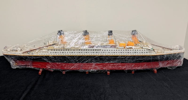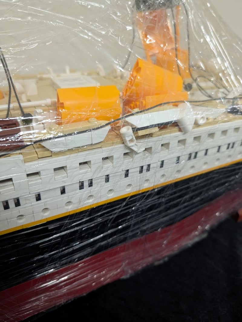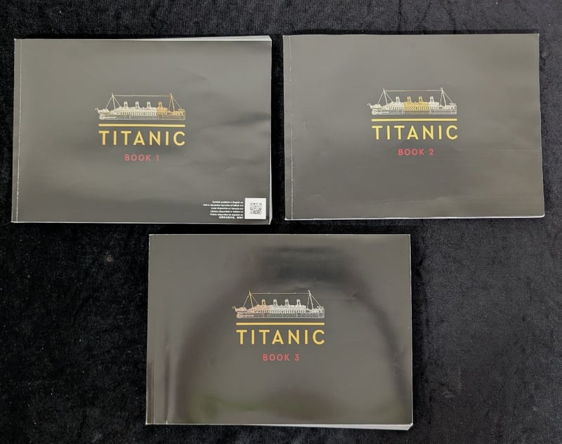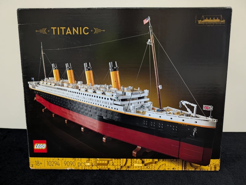 Lego Titanic Set 10294 Comprising 9,090 Pieces With Detailed White Superstructure, Black Hull, And Gold-Painted Funnels. Includes Three Instruction Manuals (Books 1-3) And Original Packaging. Model Features Accurate Maritime Detailing With Multiple Deck Levels, Window Details, And Period-Appropriate Rigging. Set Comes Pre-Built, May Contain Missing Pieces.
