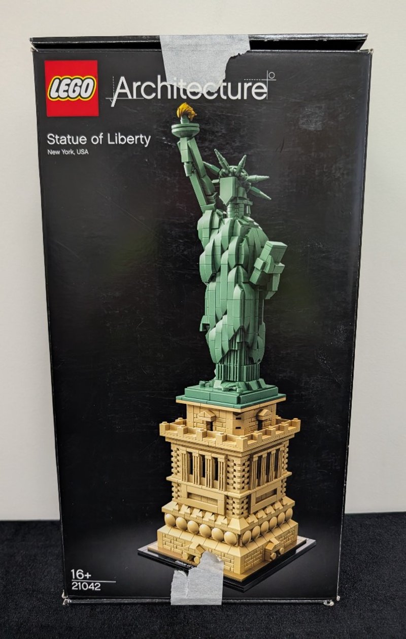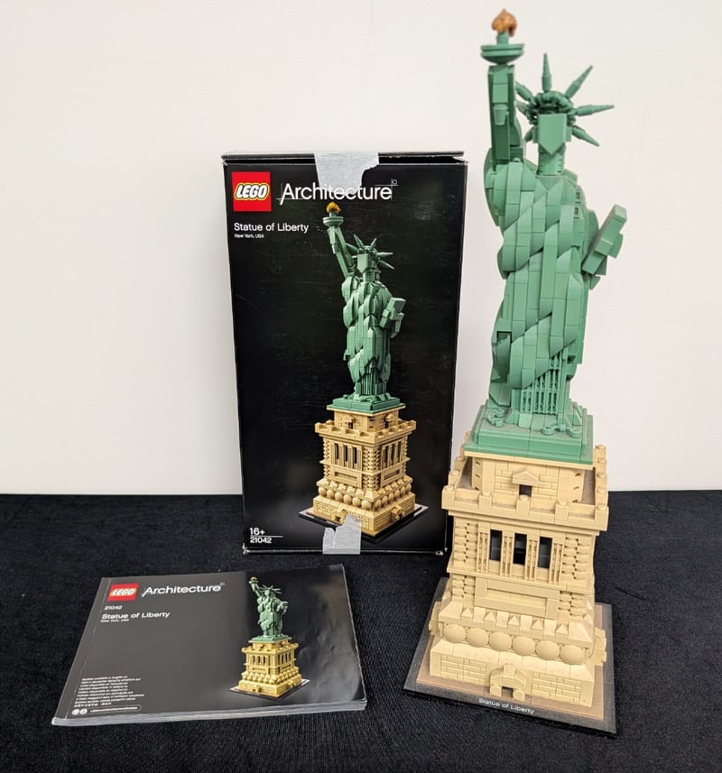 Lego Architecture Set 21042 Featuring A Detailed Brick-Built Replica Of The Statue Of Liberty, New York, Usa. The Model Comprises A Tan-Coloured Pedestal Base With Classical Architectural Detailing, Including Columned Sections And Ornamental Spheres, Supporting The Iconic Green Patina Statue With Torch-Bearing Arm And Spiked Crown. Set Comes Pre-Built, May Contain Missing Pieces.