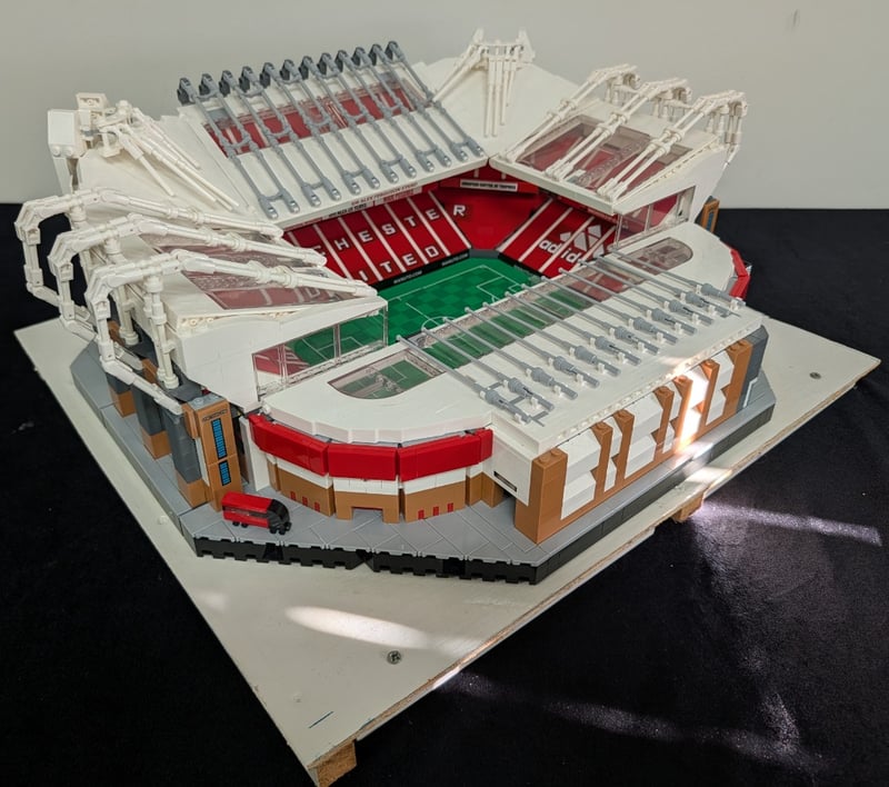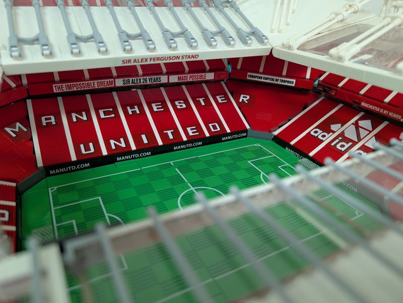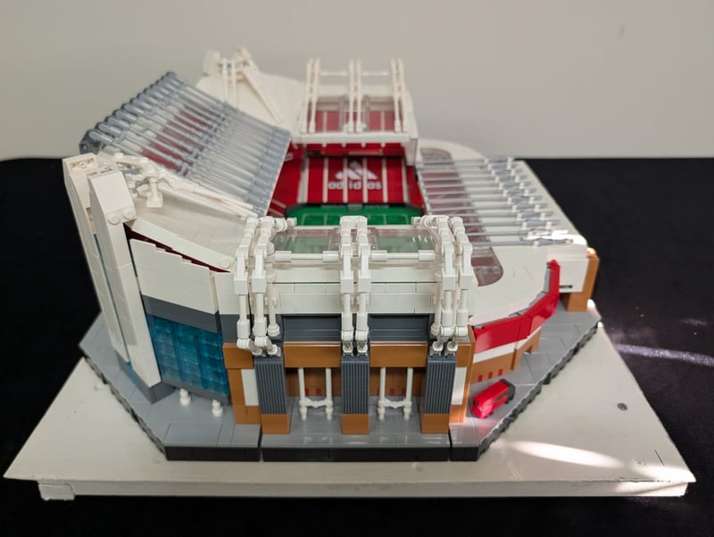 Lego Creator Expert Architectural Set Depicting Old Trafford, Manchester United'S Iconic Stadium. Features Detailed Red Brick Construction With White Structural Elements, Green Pitch With Field Markings, Tiered Seating Sections, And Sir Alex Ferguson Stand. Set Comes Pre-Built, May Contain Missing Pieces.