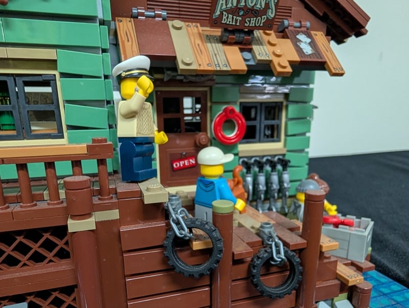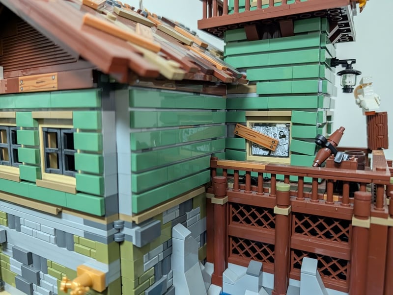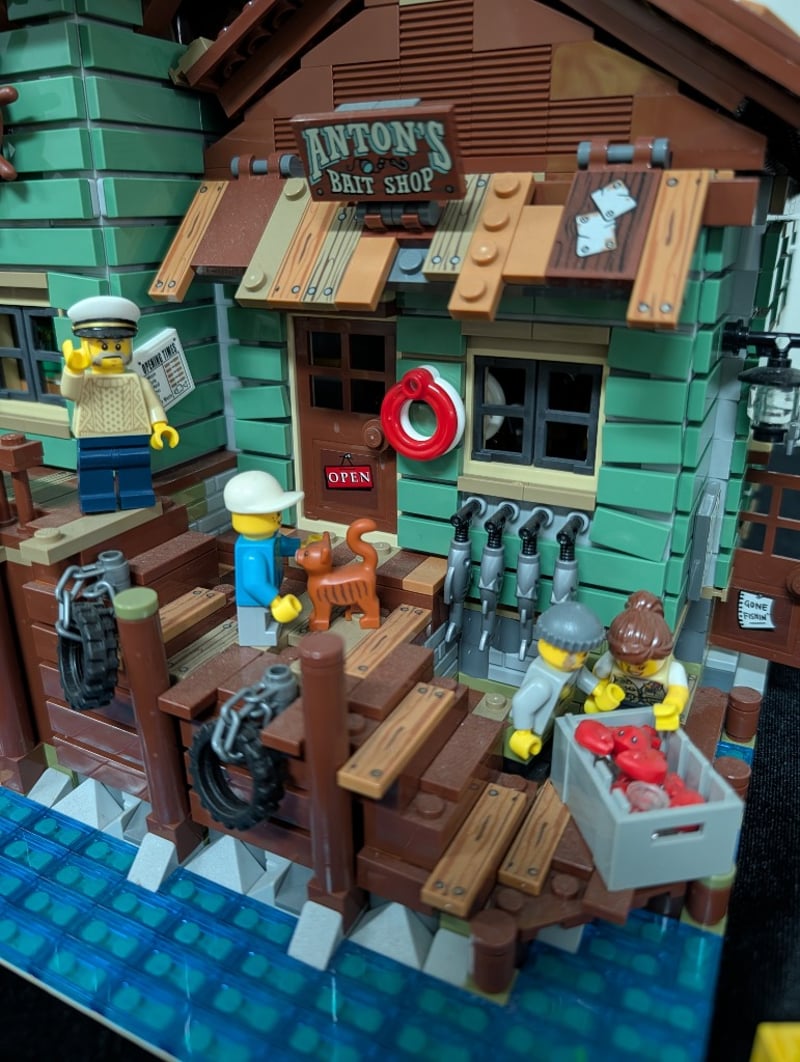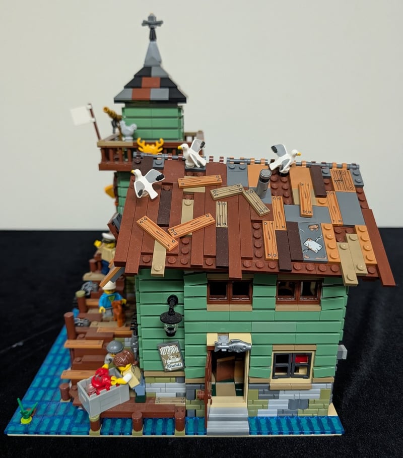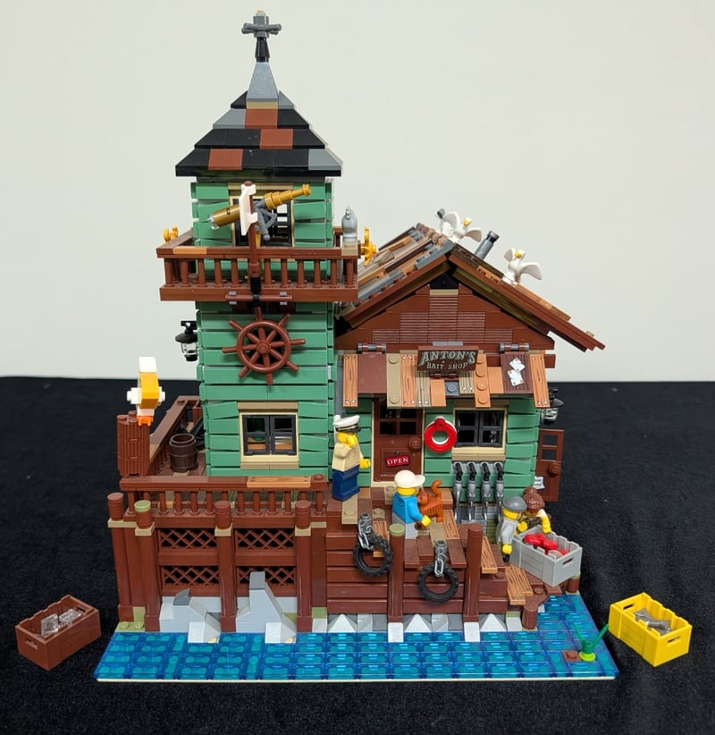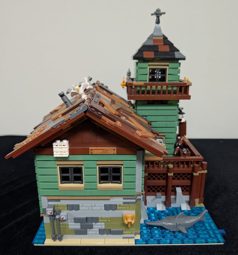 Lego Modular Building Featuring A Multi-Story Fishing Supply Store With Integrated Lighthouse Tower, Detailed Architectural Elements Including Pitched Roof With Weathered Shingles, Green Clapboard Siding, Brown Timber Framing, And Stone Foundation. Set Comes Pre-Built, May Contain Missing Pieces. Manual And Box Not Included