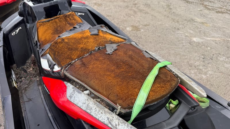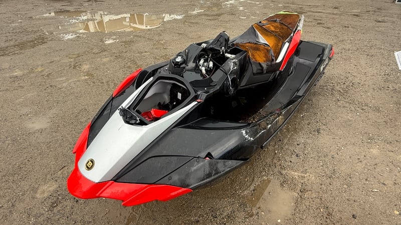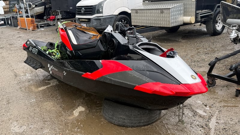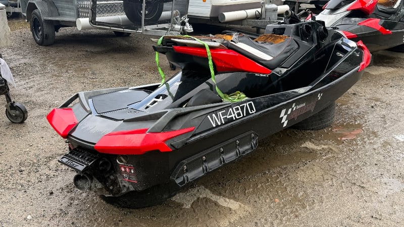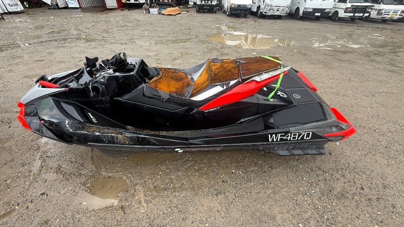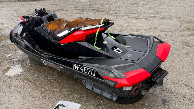 A salvage-condition personal watercraft offering potential for restoration or parts recovery, presenting an opportunity for mechanically minded buyers or marine repair specialists.