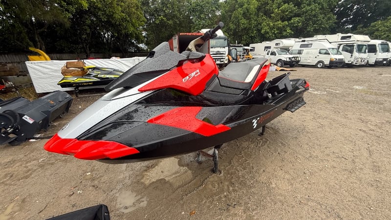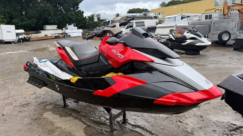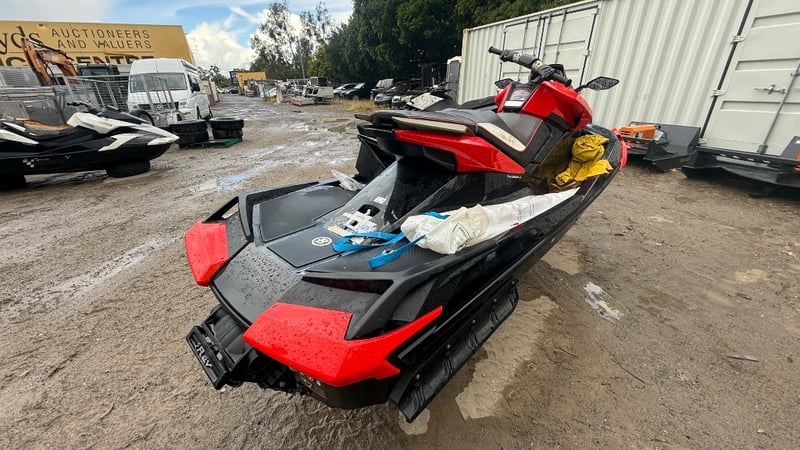 The craft is equipped with a jet drive propulsion system and features a digital instrumentation display typical of modern personal watercraft. While no structural damage has been reported, visible oxidation and general wear indicate the need for assessment prior to commissioning. The overall mechanical and operational condition is unknown.