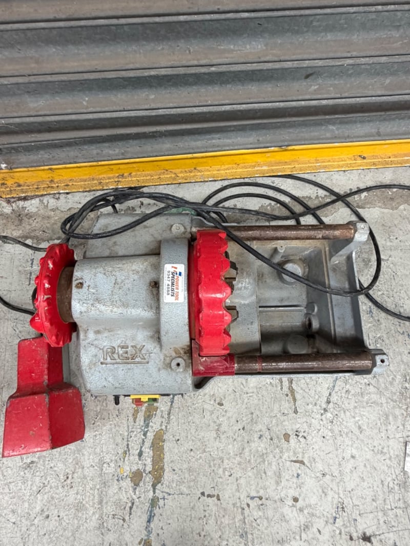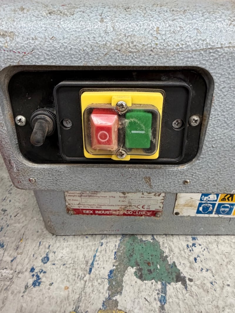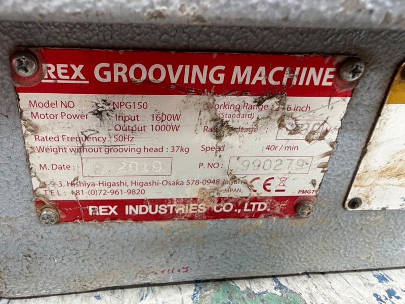 REX NPG150 Grooving Machine, Model NPG150, manufactured 2019. Japanese-made portable electric grooving tool with 1600W input motor (1000W output), operating at 50Hz rated frequency.