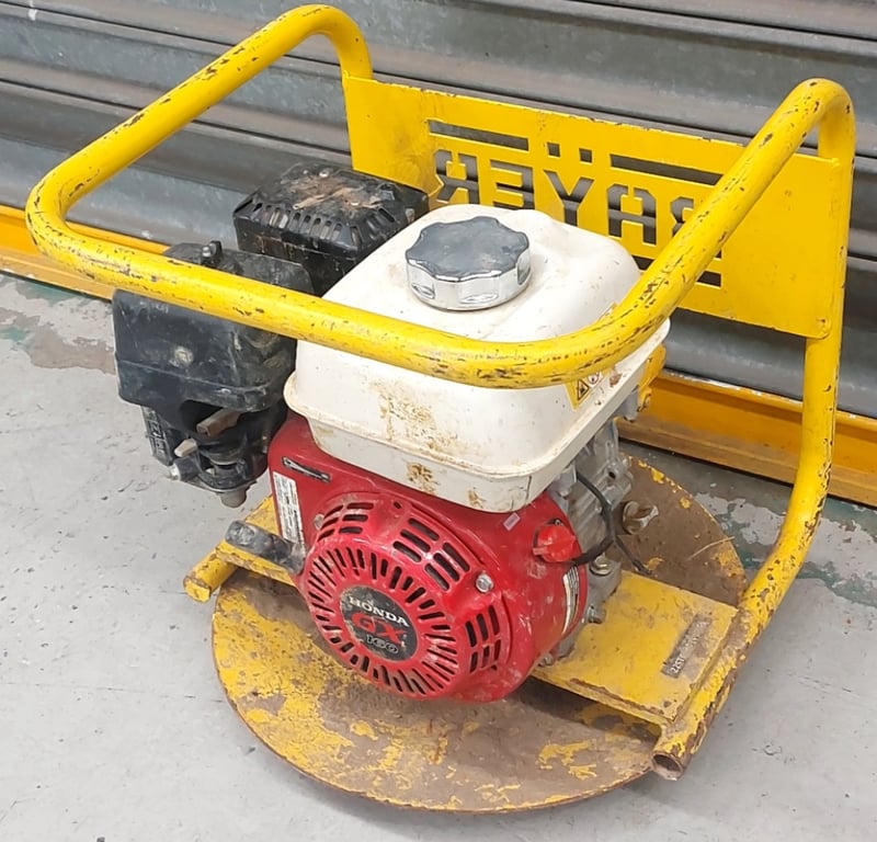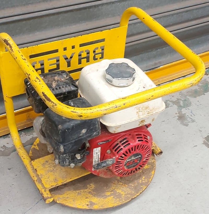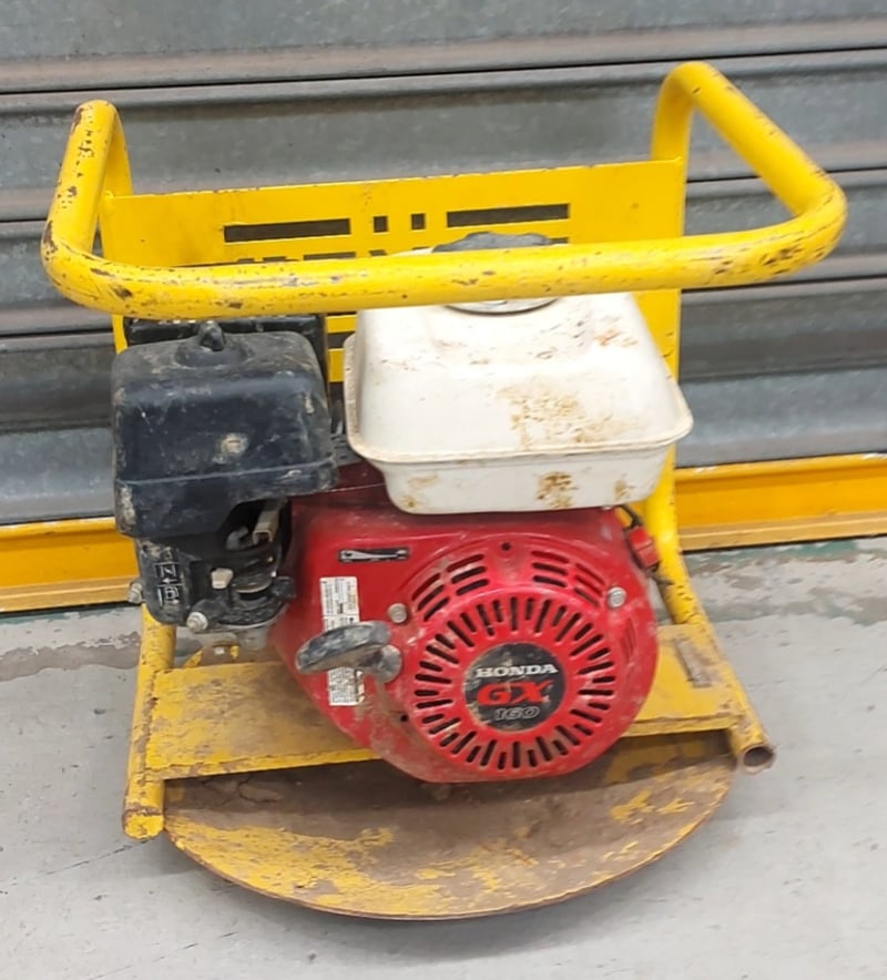 Petrol-powered plate compactor with Honda GX160 4-stroke engine. Yellow steel frame with integrated carry handles. Features white fuel tank with chrome filler cap, black engine housing, and red Honda engine block.