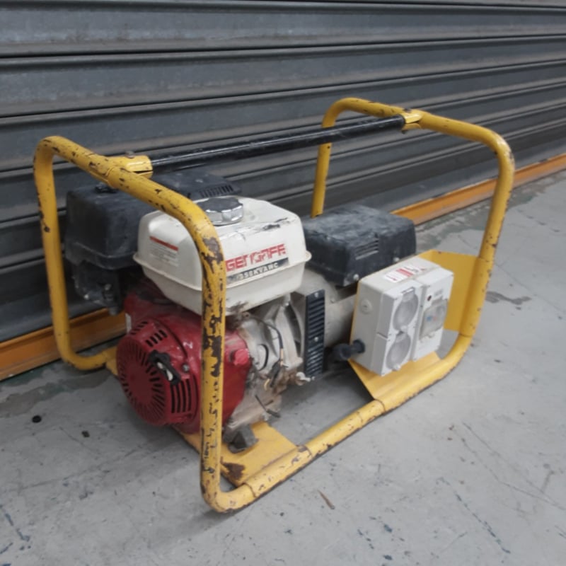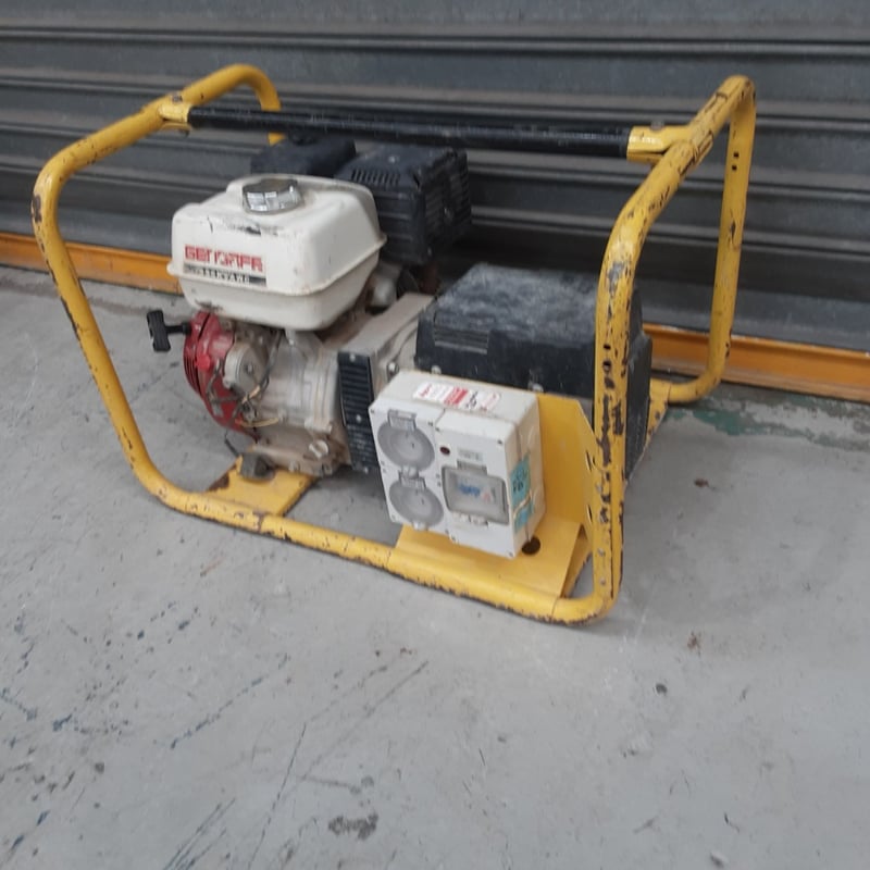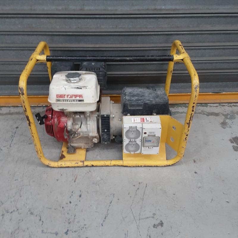 Portable petrol-powered generator set featuring a Geoforce engine with red cylinder head and white fuel tank. Yellow tubular steel frame with integrated carry handles.