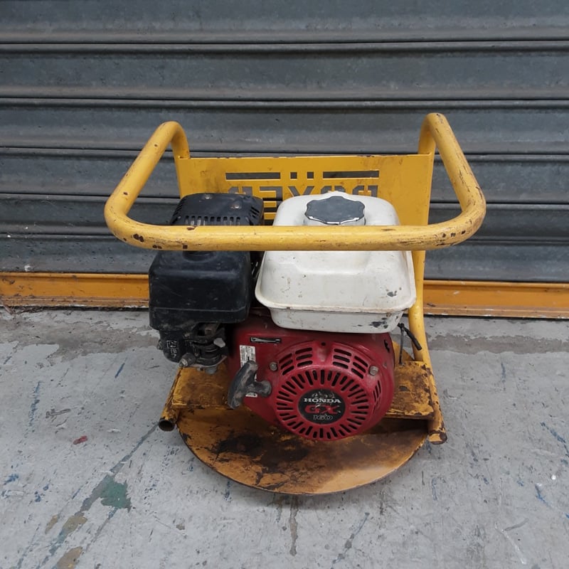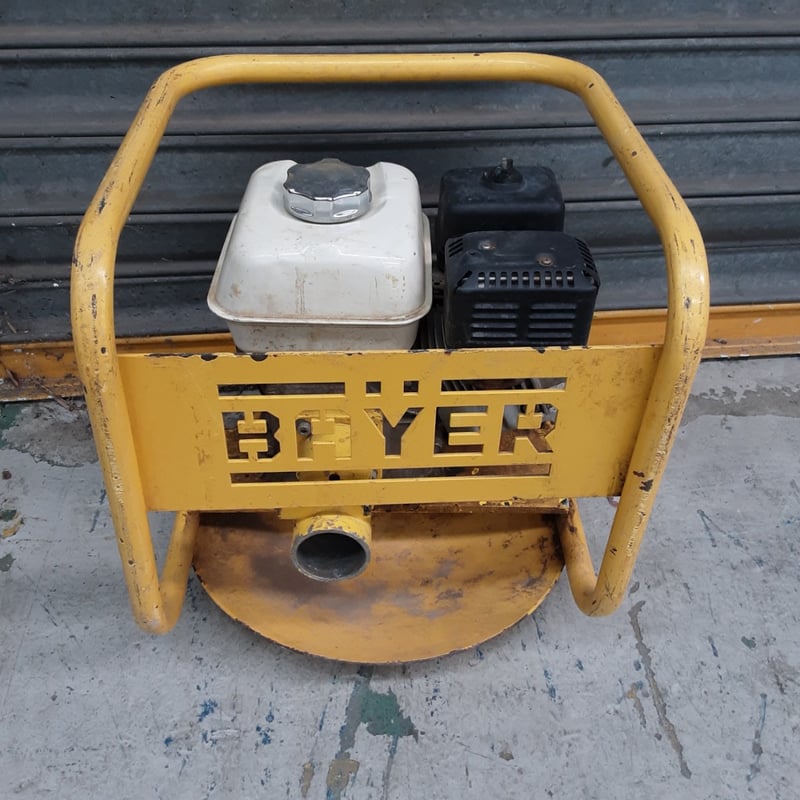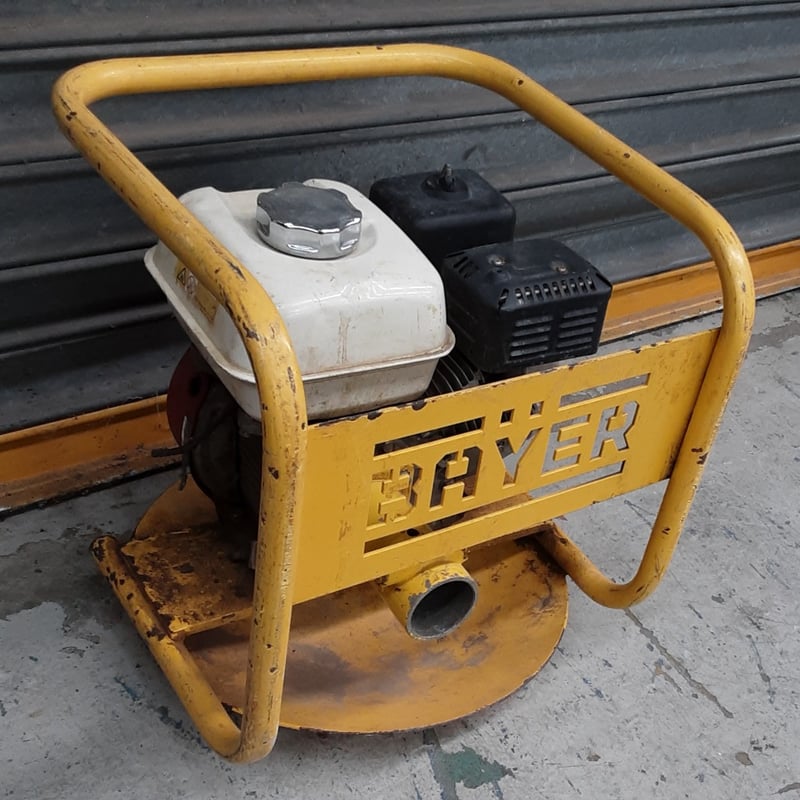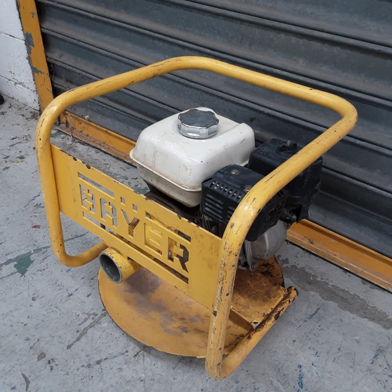 Bayer portable petrol-powered compactor/plate tamper unit. Yellow painted steel frame with dual handles for operator control. Features white fuel tank with chrome filler cap and black petrol engine (appears to be Honda GX series or similar).