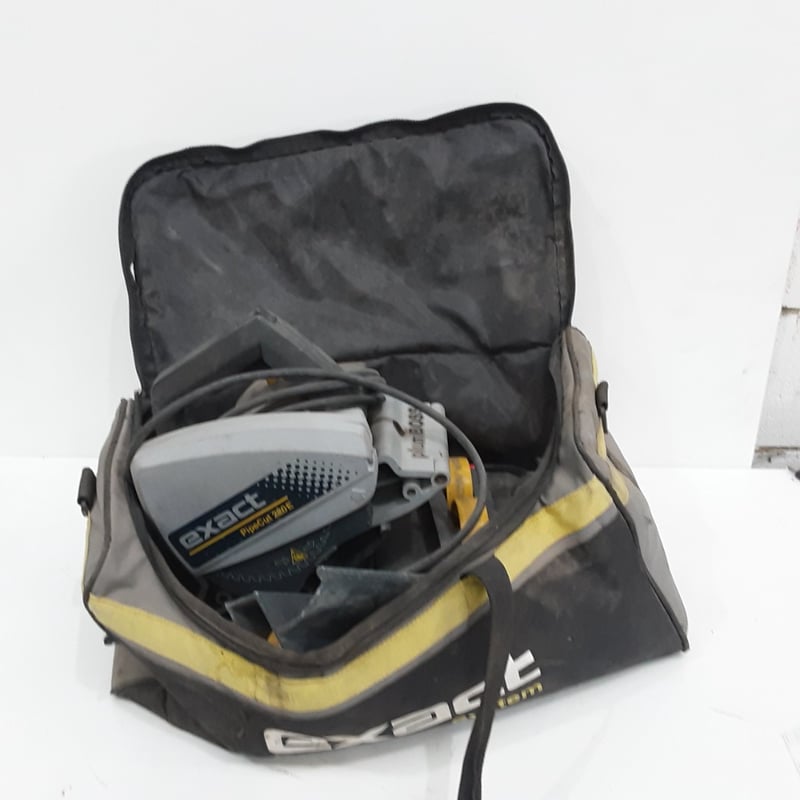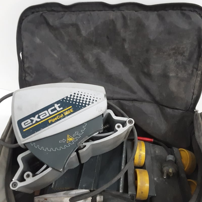 Exact PipeCut 280E portable pipe cutting system in carry case. Professional-grade tool featuring motorized cutting head with safety guard, precision blade mechanism, and yellow fabric storage bag with shoulder strap.