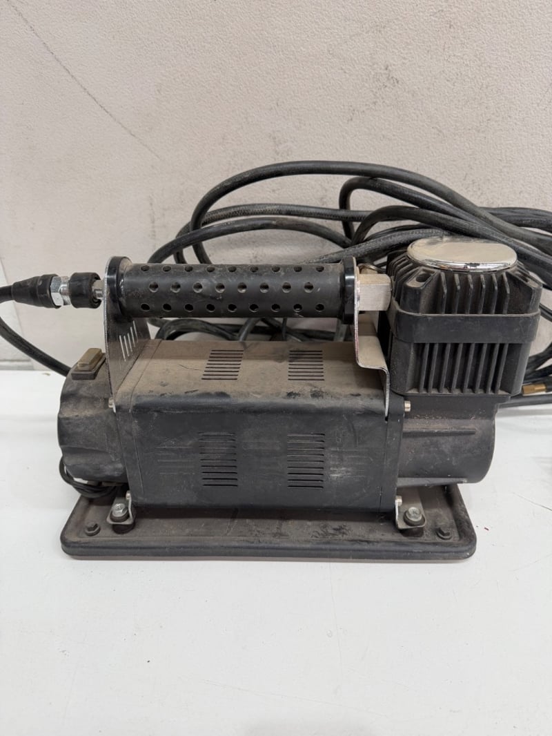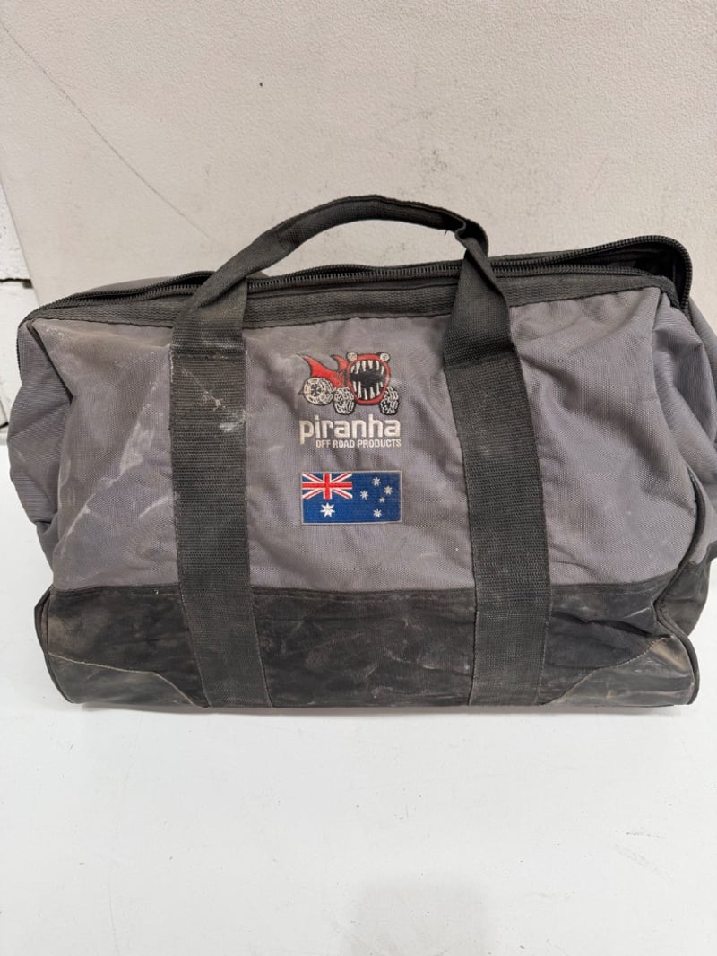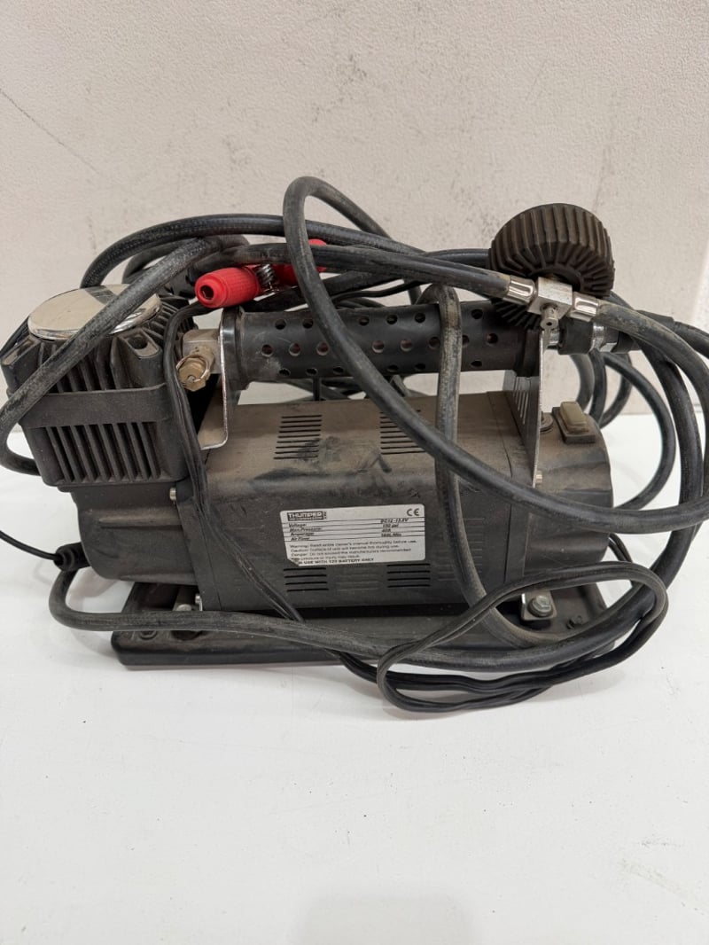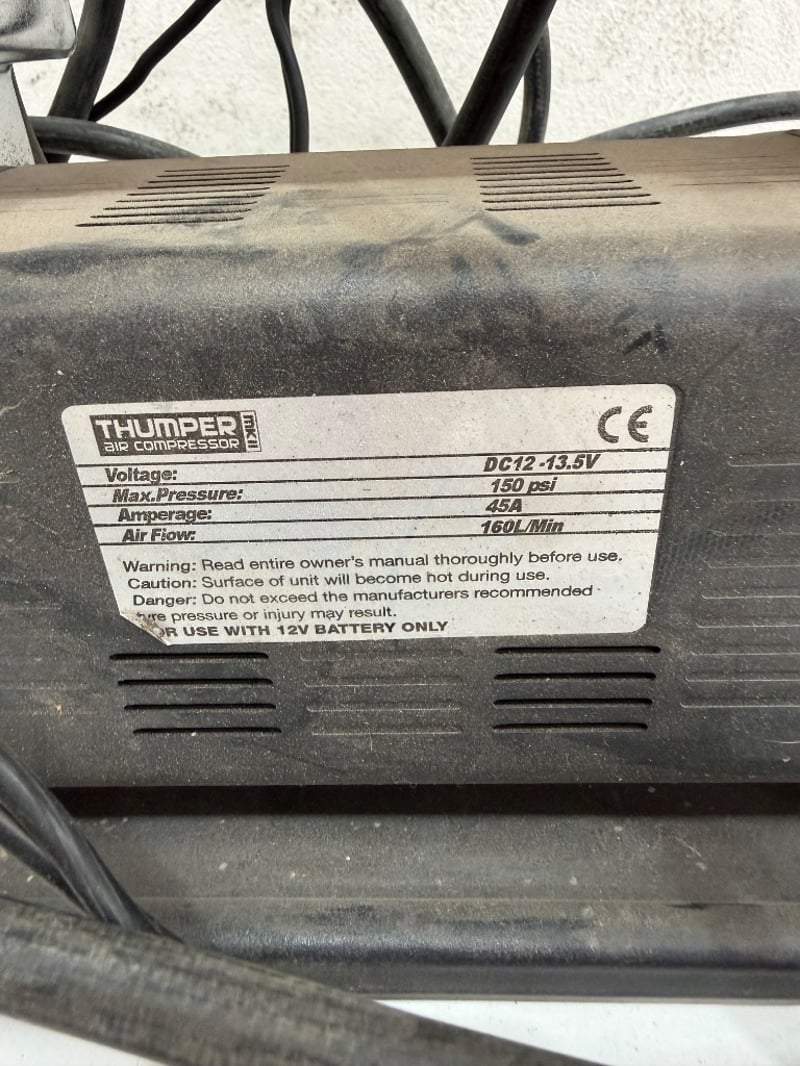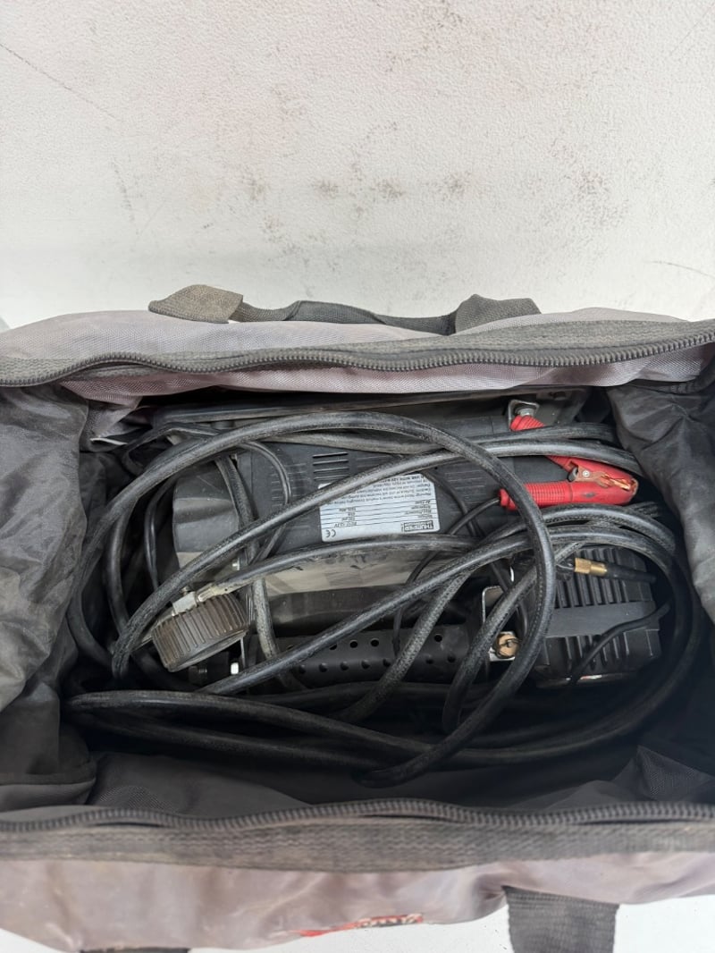 Piranha air compressor kit in carry bag. Includes Thumper 12V air compressor (DC12-13.5V, 150 psi max pressure, 45A amperage, 160L/min air flow) with dual power cables