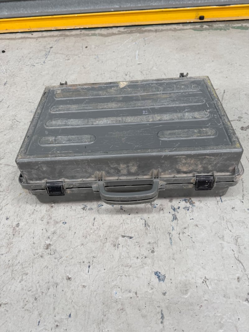 Assortment of metal fasteners in a toolbox with dual-tier compartmentalized storage system. Features a sturdy grey metal construction with reinforced corners and dual carry handles.