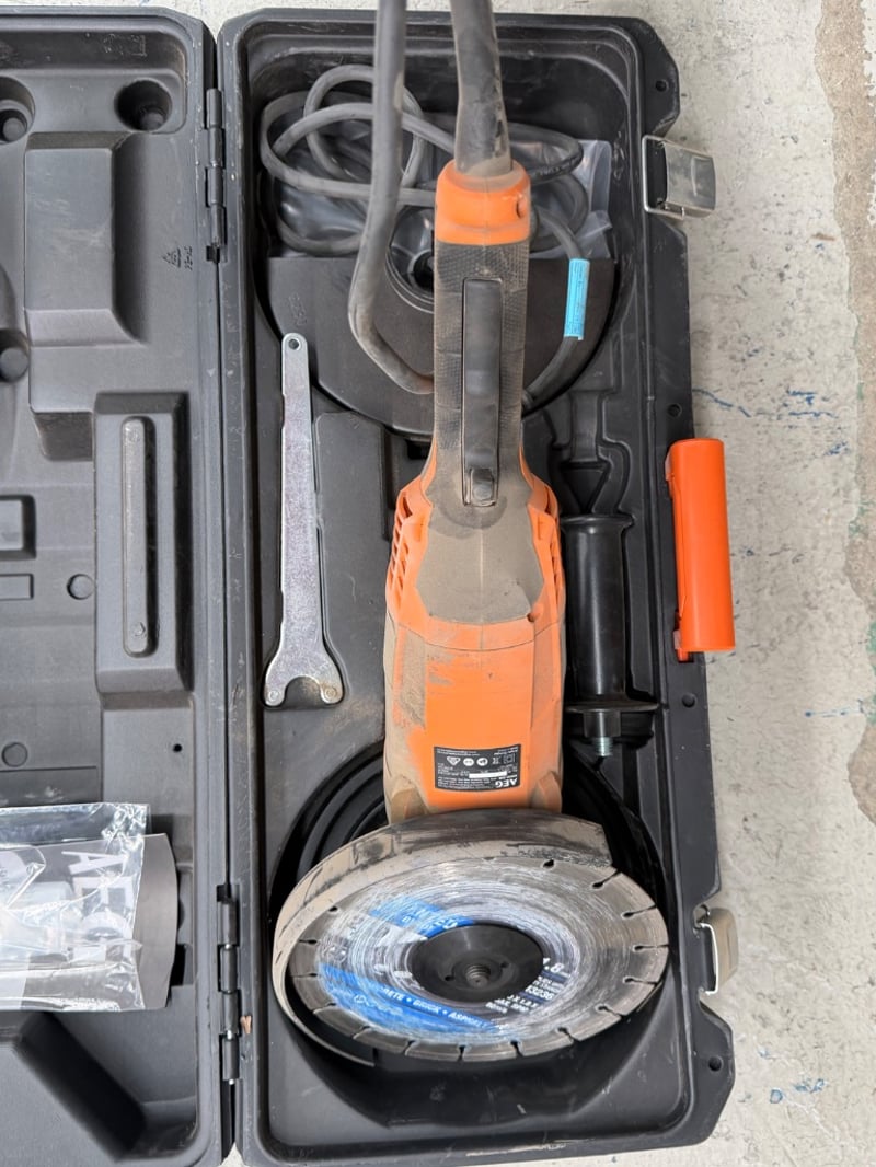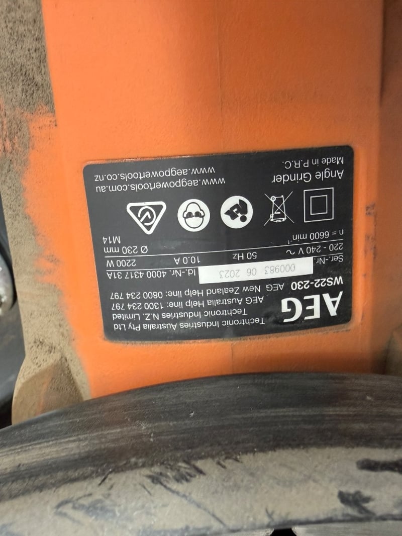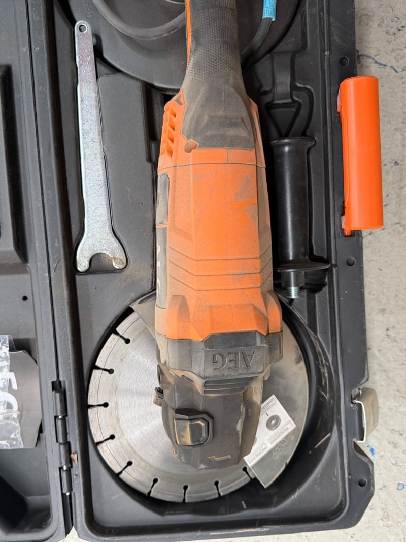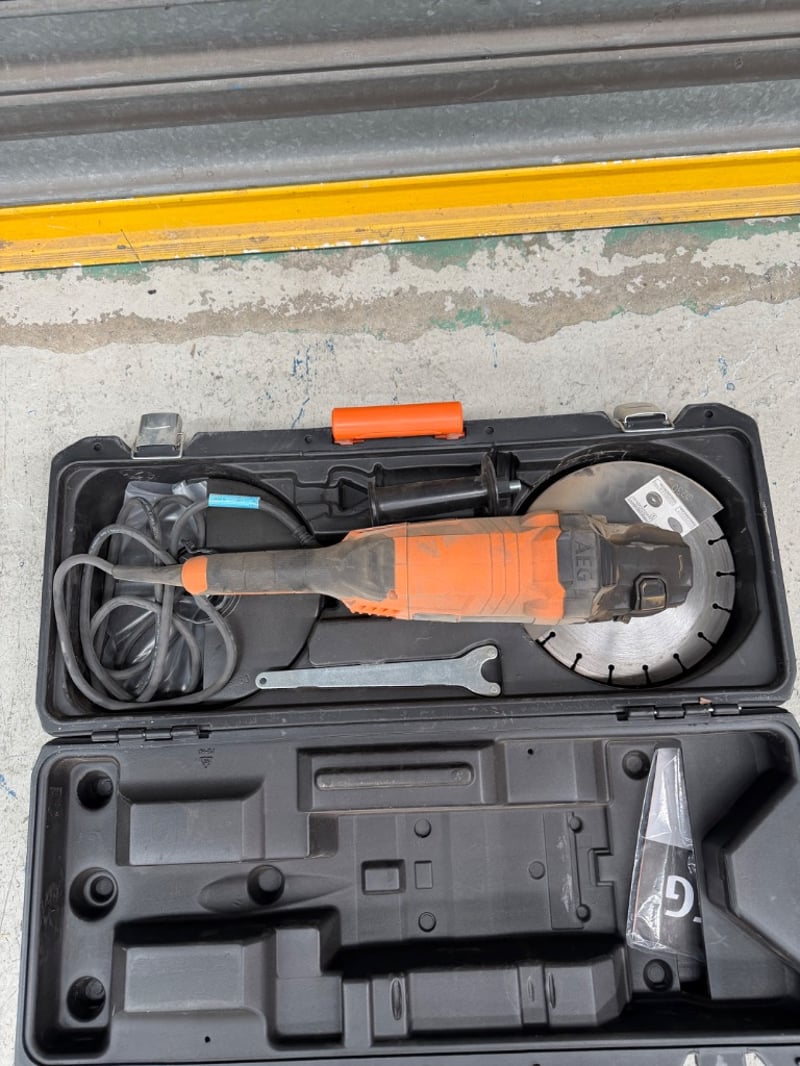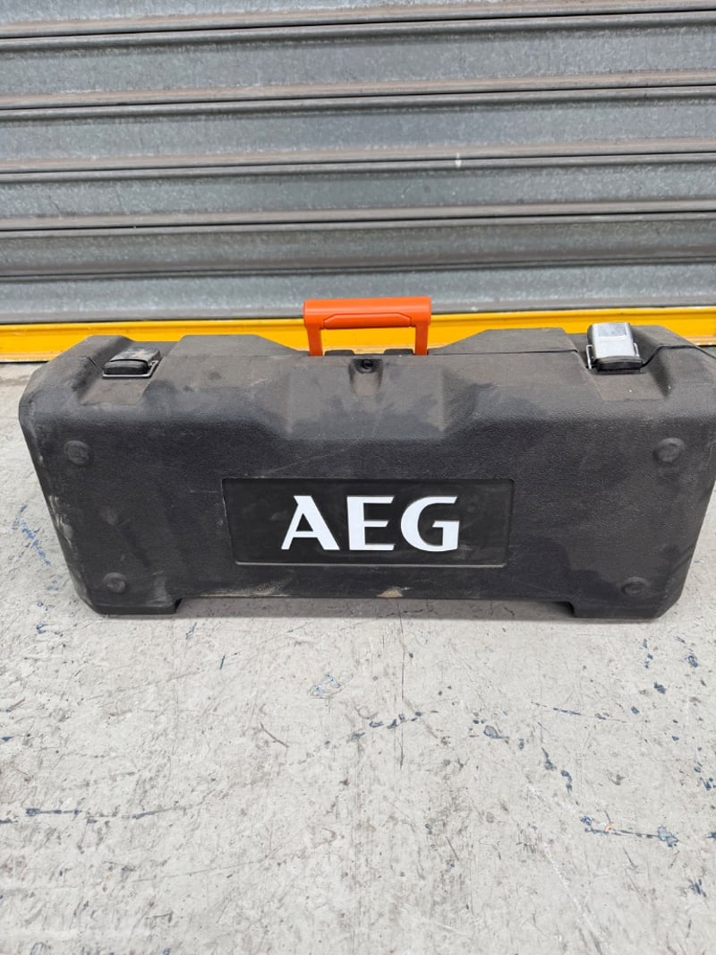AEG MSZ22-230 angle grinder kit in carrying case. 230mm disc diameter, 2200W motor with 50Hz/60Hz dual voltage capability. Complete with original black plastic carrying case featuring orange handle and AEG branding.