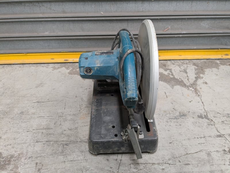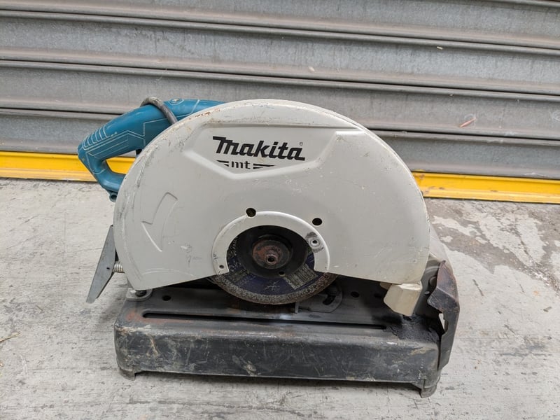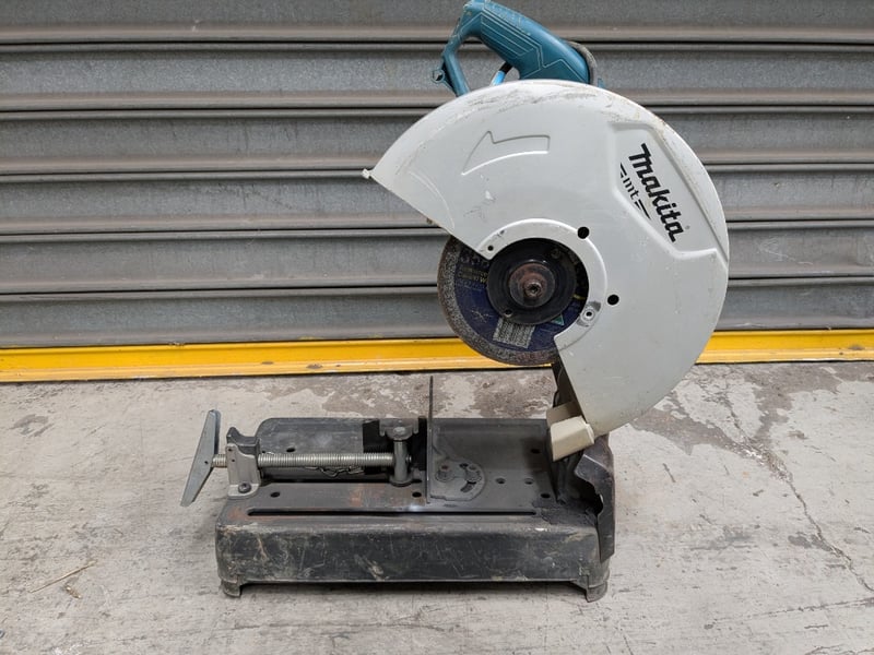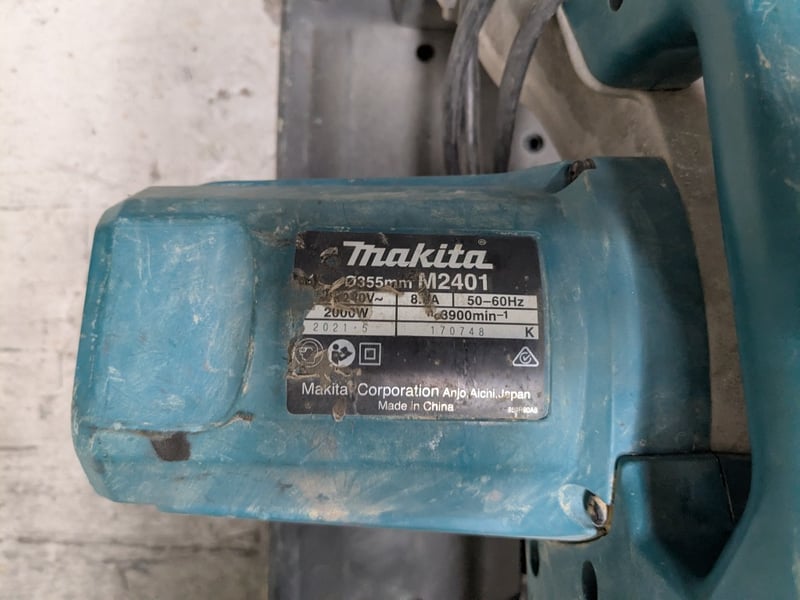 Makita M2401 355mm chop saw with 2000W motor, 3900 rpm spindle speed, 230V/50-60Hz operation. Features white protective guard, blue handle, and robust cast iron base. Includes adjustable vise clamp mechanism for secure workpiece holding.