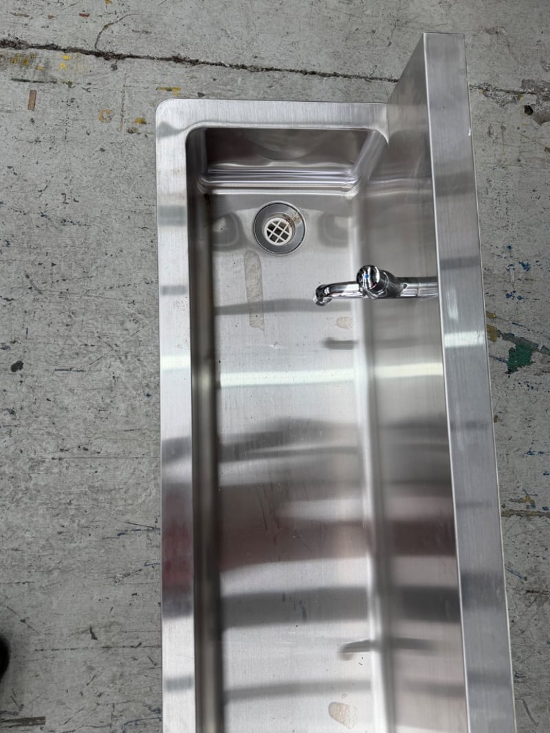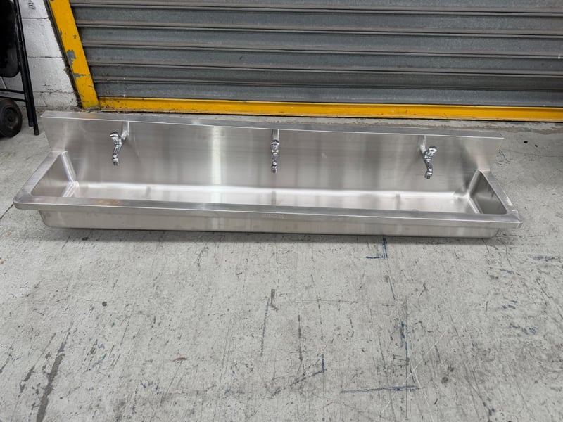BRITEX PWD Wall Mounted Stainless Steel Trough - Multi-tap Commercial Sink. Features 3 chrome taps with individual controls, polished 304-grade stainless steel construction Approx. Dimensions: 180Wx38Hx 40D cm