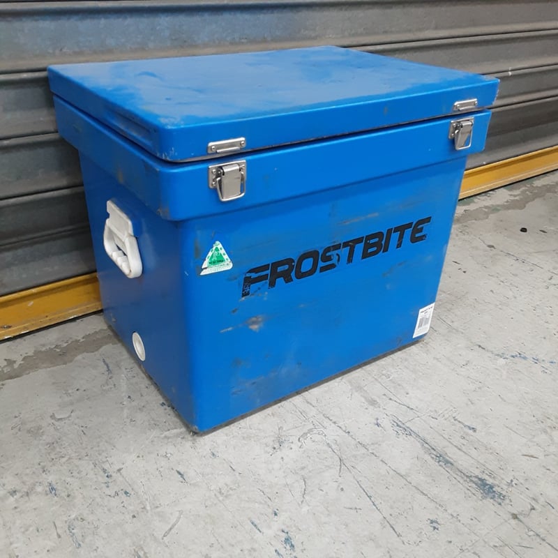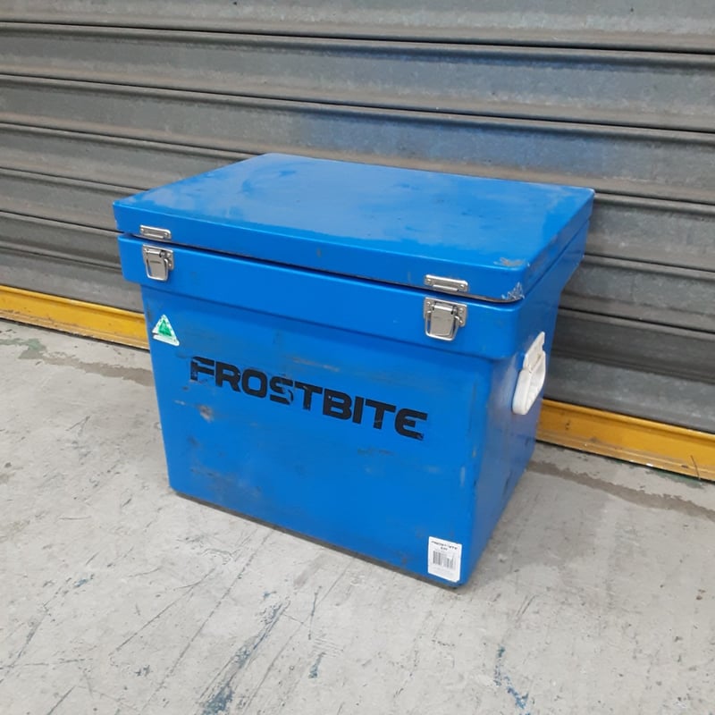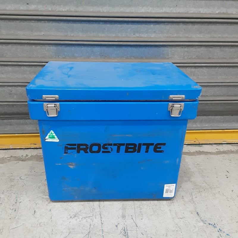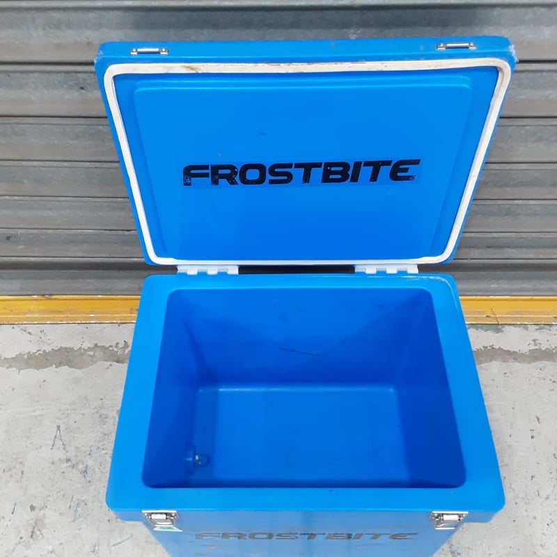 Frostbite brand portable cooler/ice box in bright blue polyethylene construction.