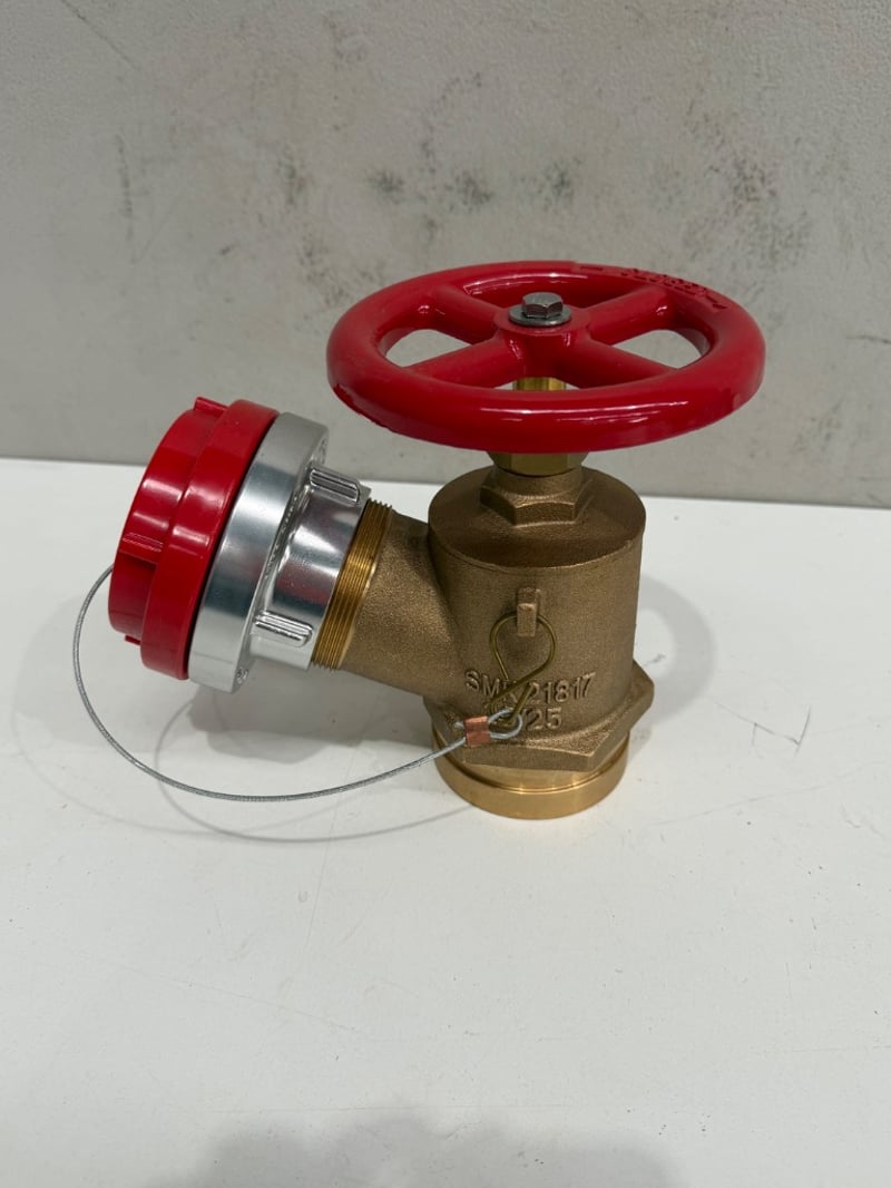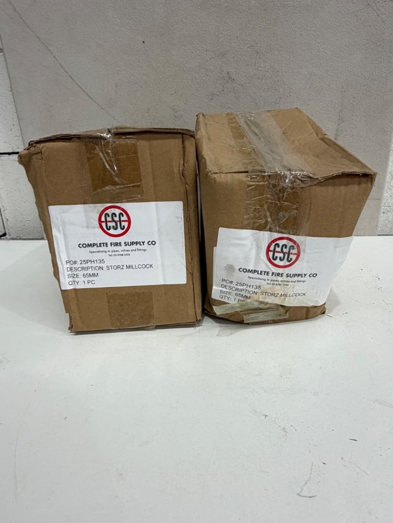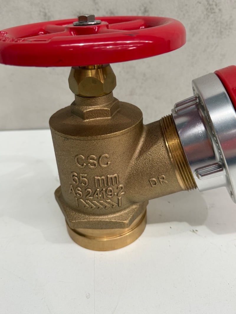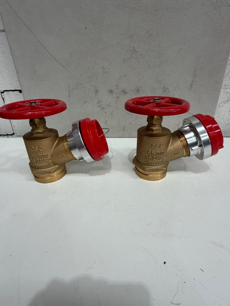 Pair of brass fire service angle valves (Storz millcock), 65mm size, manufactured by Complete Fire Supply Co. SOLD AS LOT