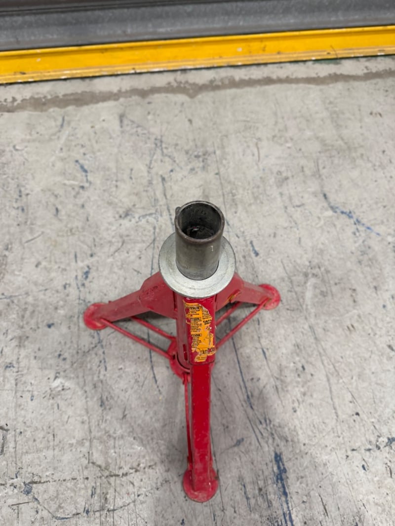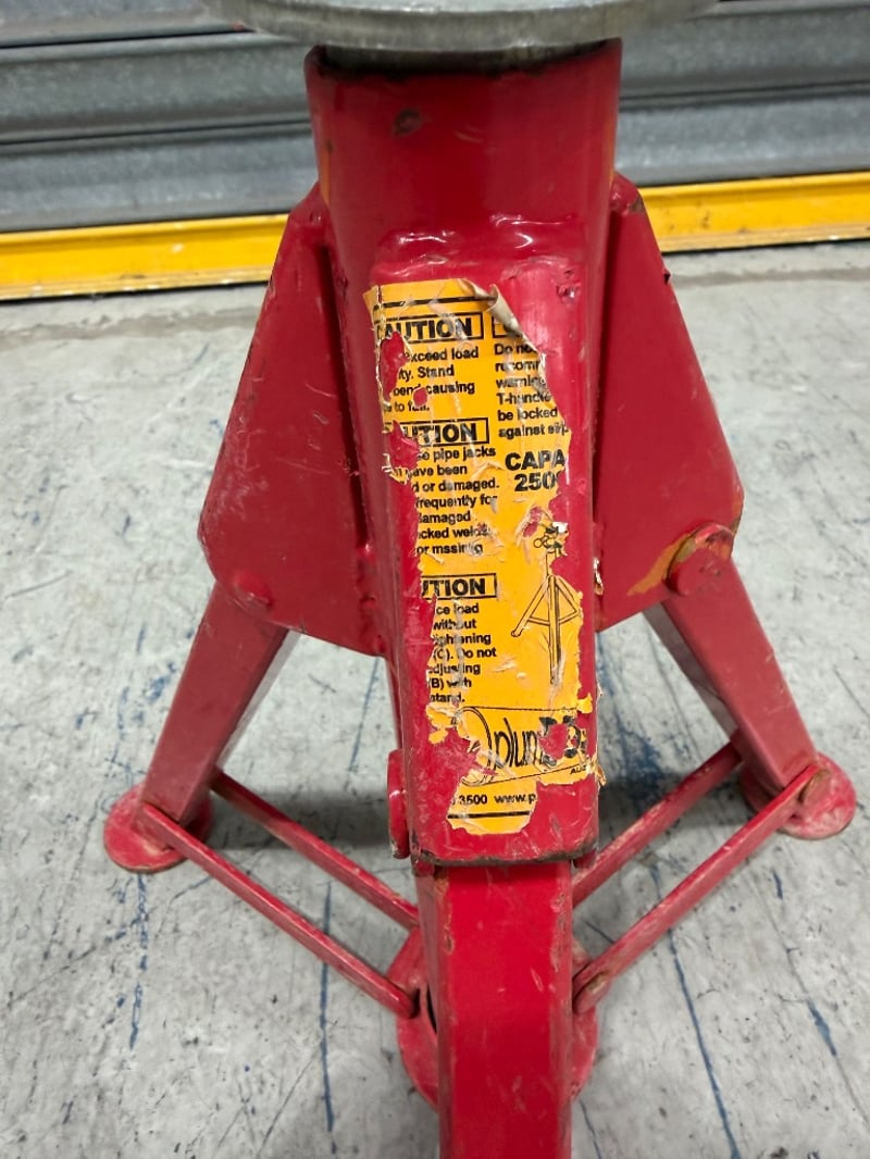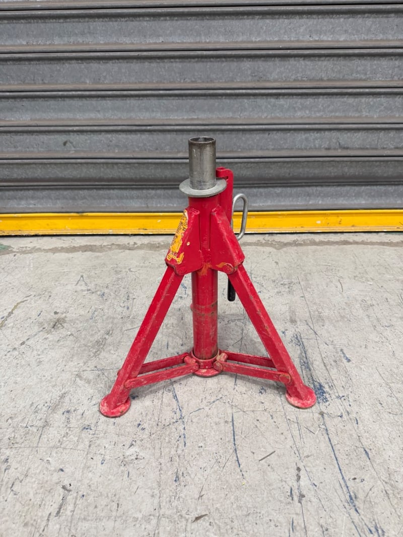 Red jack stand with welded steel construction.