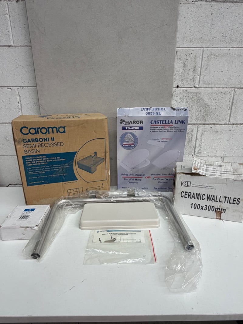 Bathroom fixtures bundle – basin, toilet seat, accessories & tiles. SOLD AS LOT