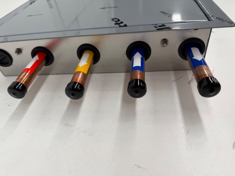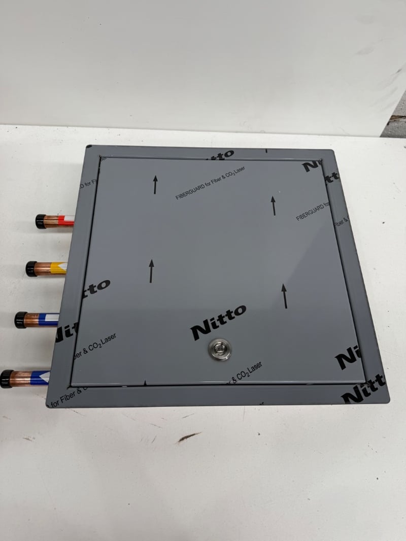 Nitto brand CO2 laser cutting head assembly featuring a precision-engineered optical platform with integrated cooling system. The unit includes four color-coded copper tube connectors (red, yellow, blue, and blue/white) for gas and coolant circulation. The grey anodized aluminum housing displays "Nitto" branding and directional flow arrows. The top panel features a central mounting point and alignment indicators. This appears to be a professional-grade laser optics module designed for industrial cutting applications. Untested, sold as is.