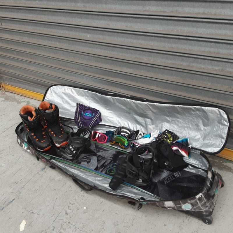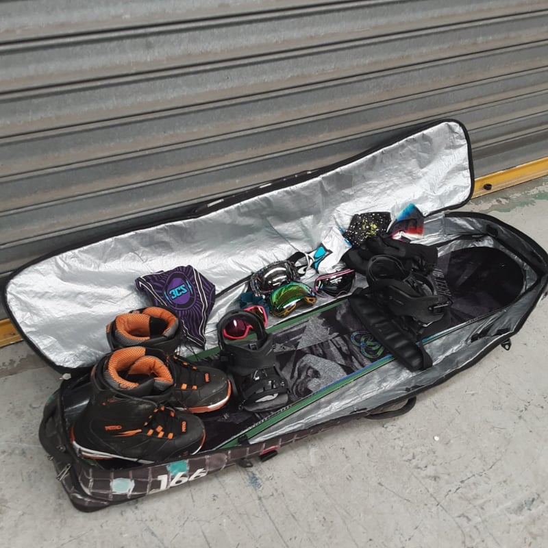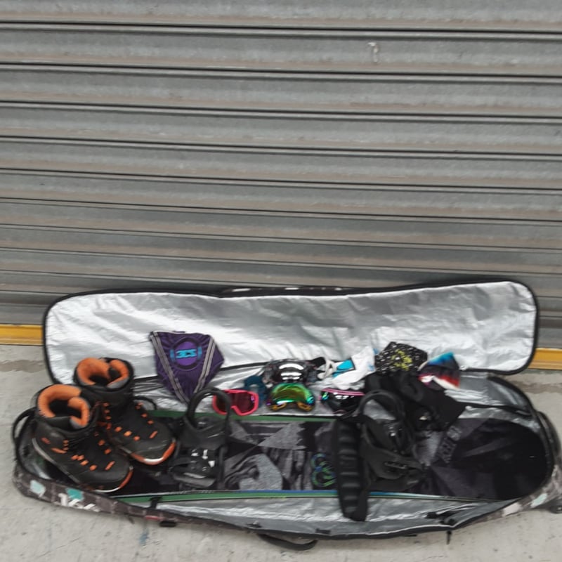 Complete snowboarding featuring a professional-grade snow board, twin-tip design with visible foot straps. Includes protective gear