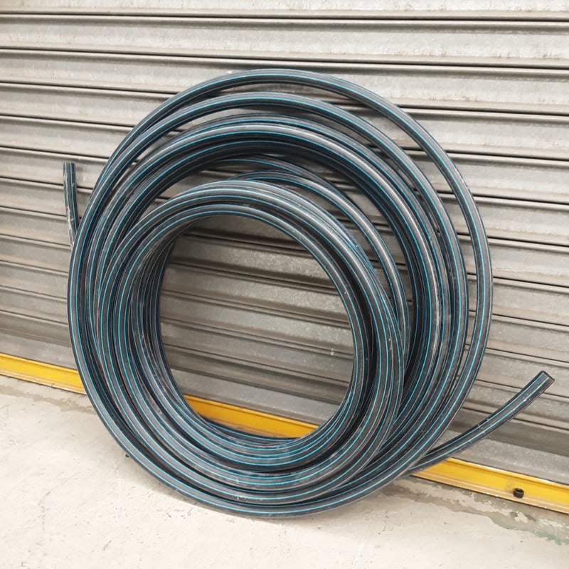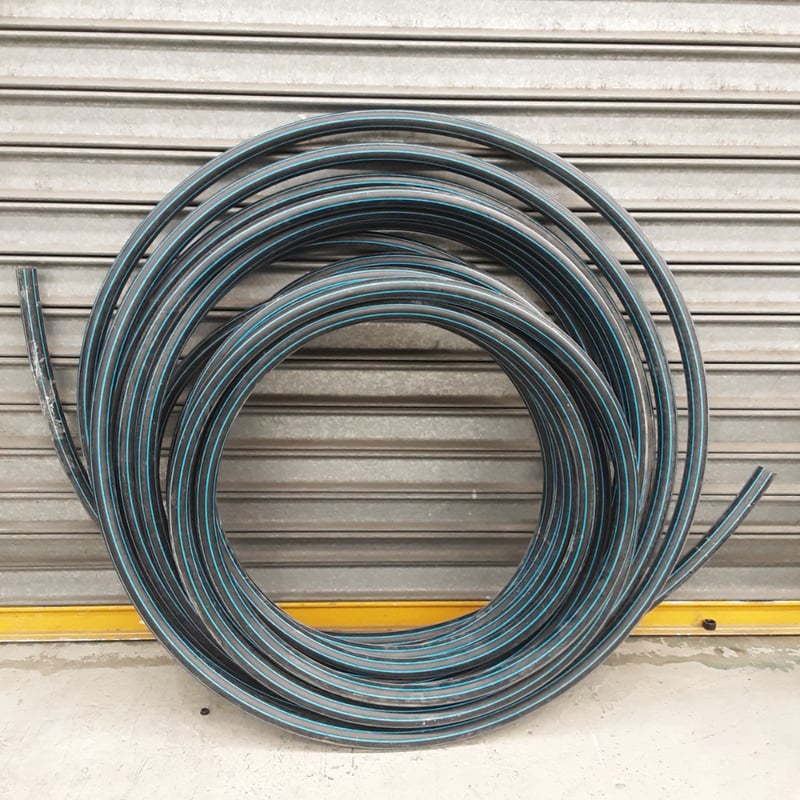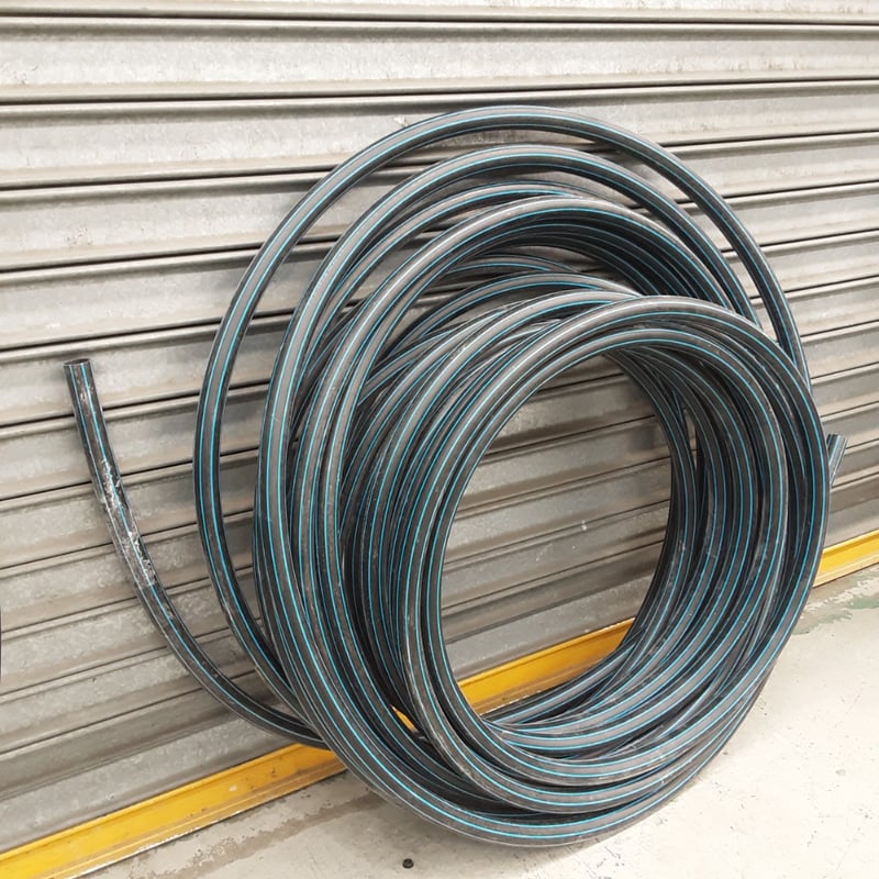 Coiled black polyethylene agricultural/irrigation tubing with blue stripe markings. Multiple coils of varying diameters displayed. Heavy-duty construction suitable for water distribution, garden irrigation, or livestock watering systems. Appears to be professional-grade tubing in excellent working condition. Ideal for rural, agricultural, or horticultural applications requiring reliable fluid conveyance.