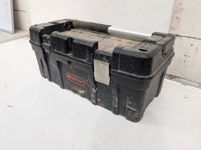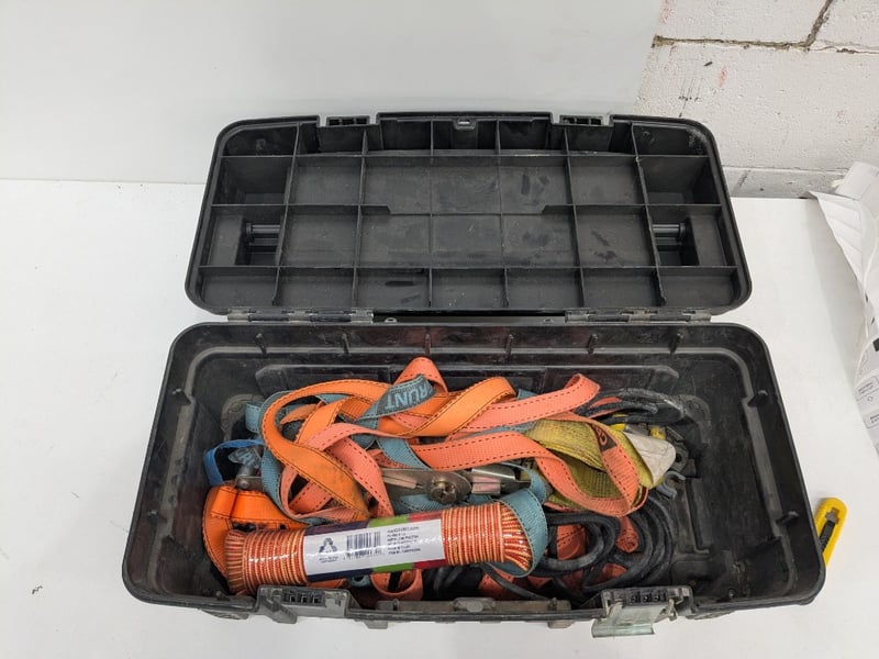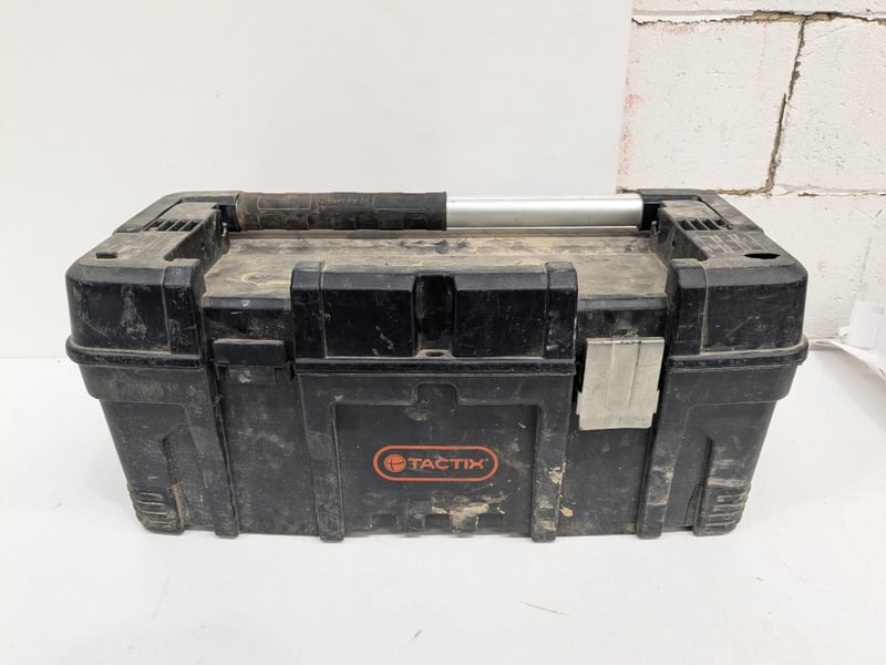 Tactix modular tool box Made with durable hard plastic and heavy duty metal latches With assorted tools including straps, ropes and moreMissing a latch