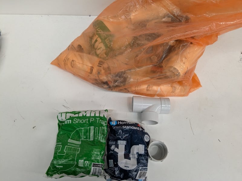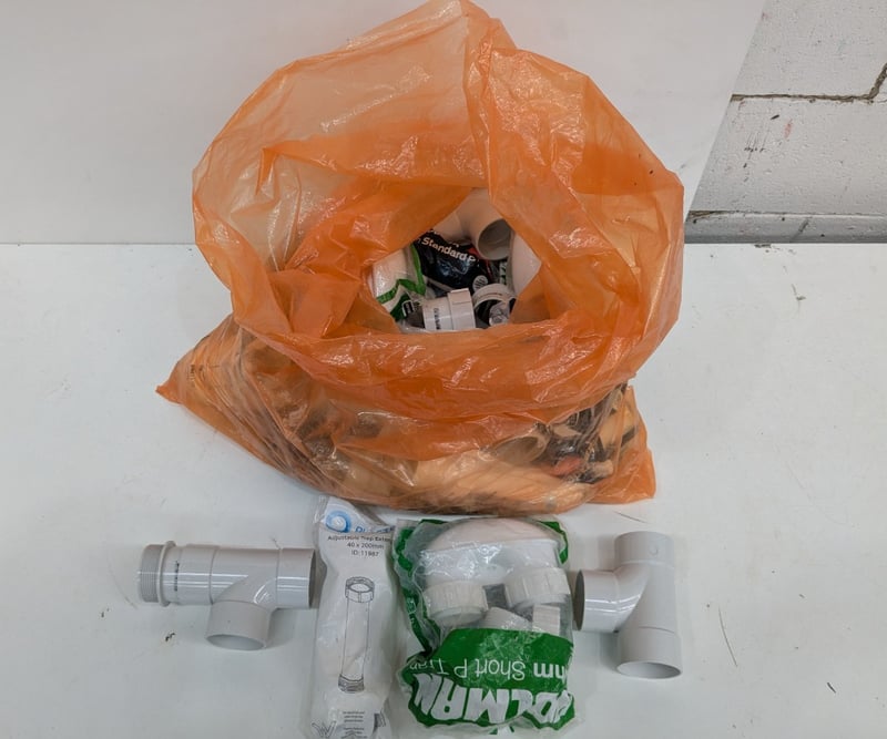 Plumbing and drainage components containing assorted PVC fittings including standard P-traps, adjustable waste bends (40 x 200mm), connector tees, and elbow joints. All items appear unused and in factory packaging. Suitable for bathroom or kitchen drainage installation. Contents include white PVC pipe fittings of various configurations and sizes.Sold as lot