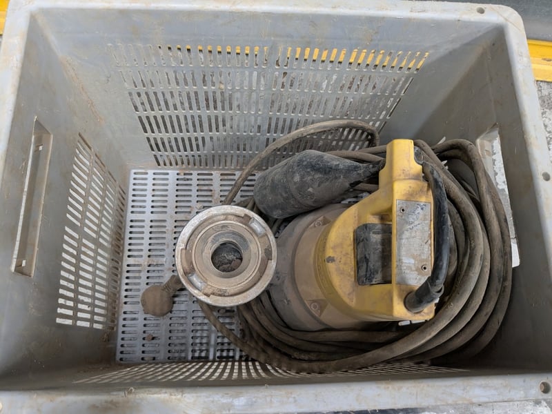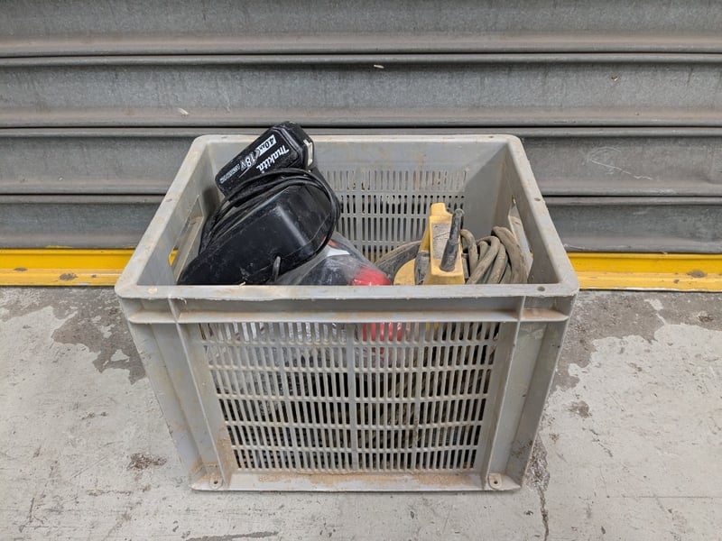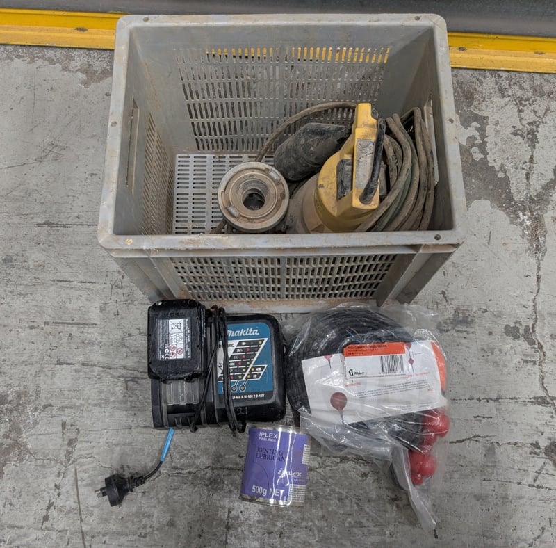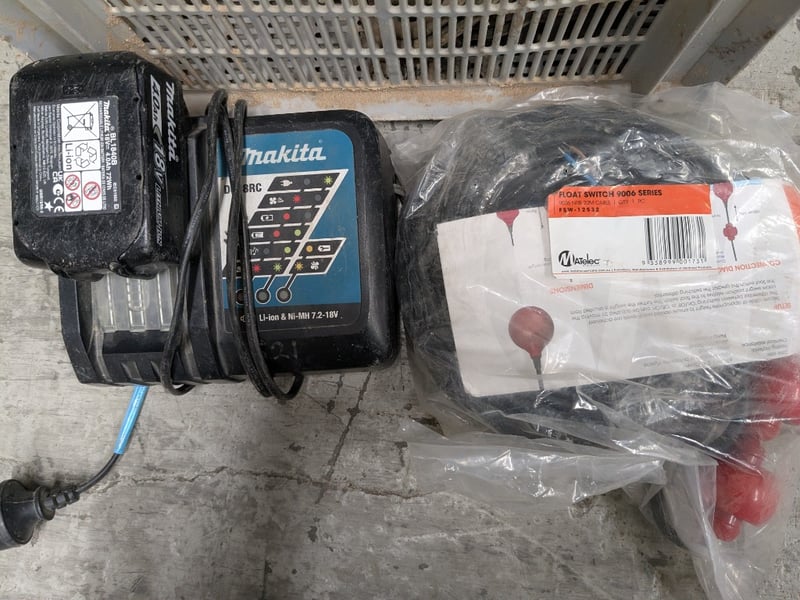 Comprehensive tool and equipment lot featuring industrial-grade machinery and accessories. Contents include a yellow Jung Pump designed for stationary or portable use to handle "faecal-free" wastewater, such as rainwater, lightly polluted water, or domestic greywater from washing machines, Matelec Float Switch 9006 Series, Makita cordless drill charger (Li-ion 7.2-18V) with battery pack, joint lubricant (500g Iplex brand)Sold as lot
