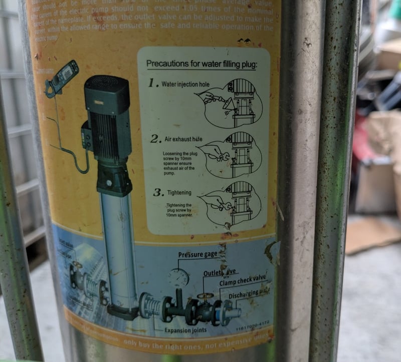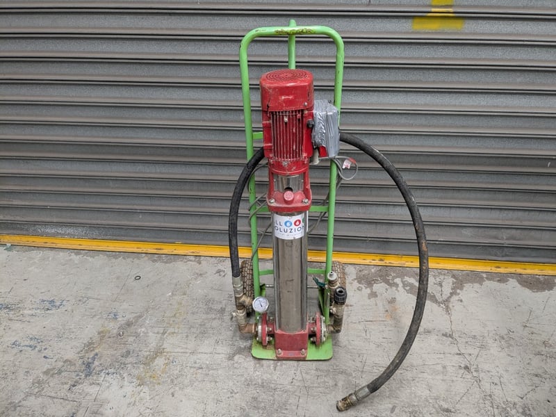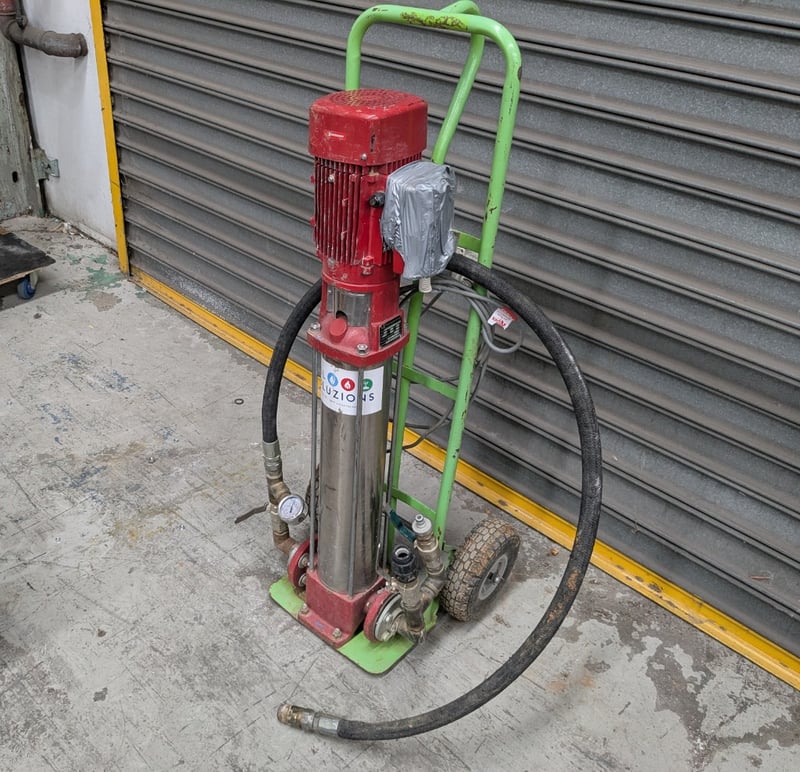 CV1-36 vertical multistage centrifugal pump. This type of pump is commonly used for high-pressure water supply, irrigation, and boosting pressure from tanks. Features red motor housing mounted on green trolley Includes pressure gauge, outlet valve, clamp check valve, discharging plug, and expansion joints. Equipped with black high-pressure hose assembly and manual water-filling plug with air exhaust hole. Industrial-grade construction suitable for hydraulic applications. Shows operational wear consistent with workshop use.