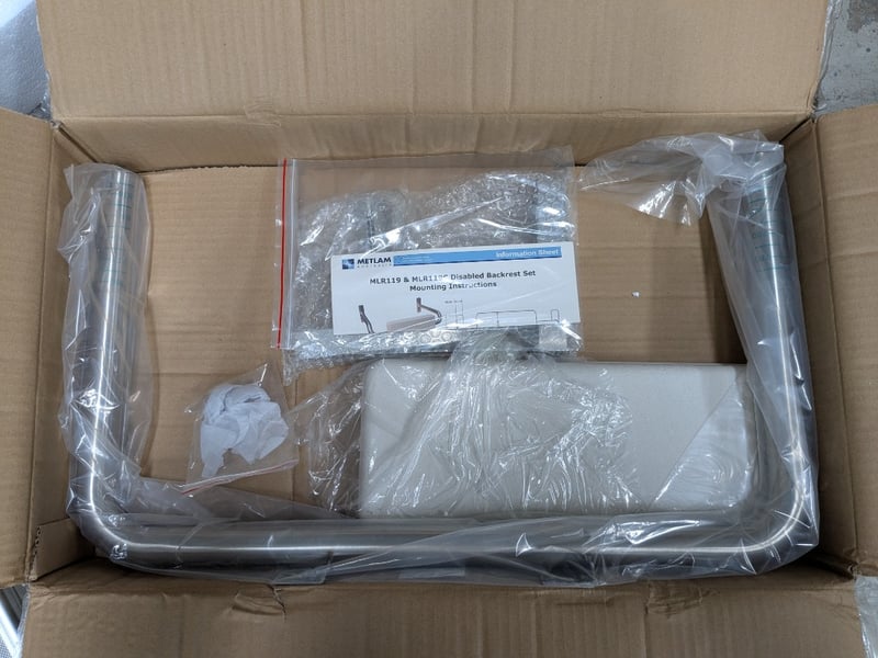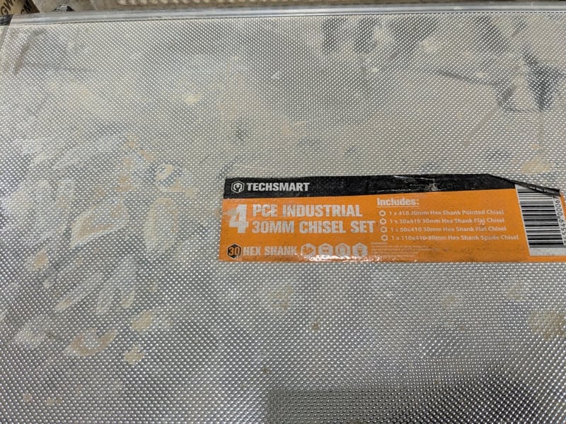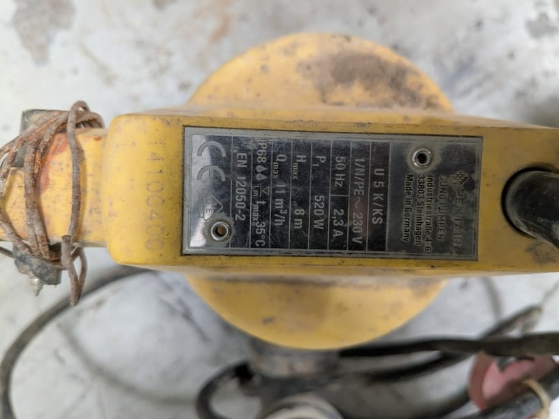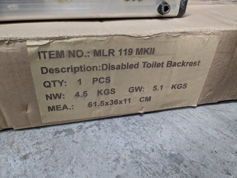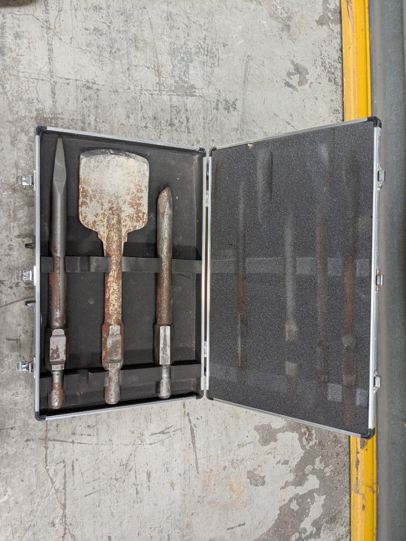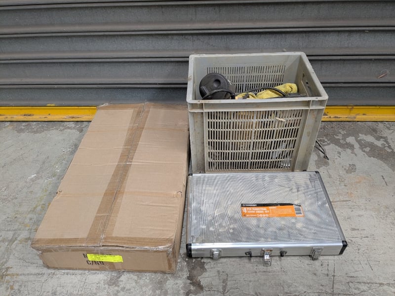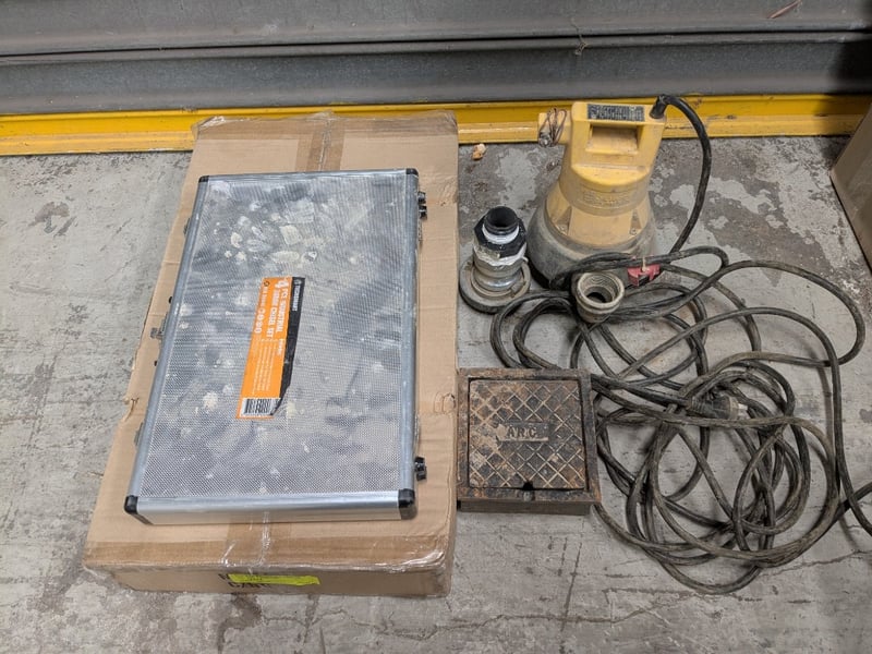 Comprehensive construction and site equipment lot including a Meylam MLR119 MKII disabled toilet backrest (new, boxed), industrial submersible pump with yellow casing and original nameplate, heavy-duty tool case containing shovel/spade and chisel, aluminium tool case with orange TechSmart 4-piece 30mm chisel set, plastic storage crate with jung pump and fittinga with cast-iron access cover.