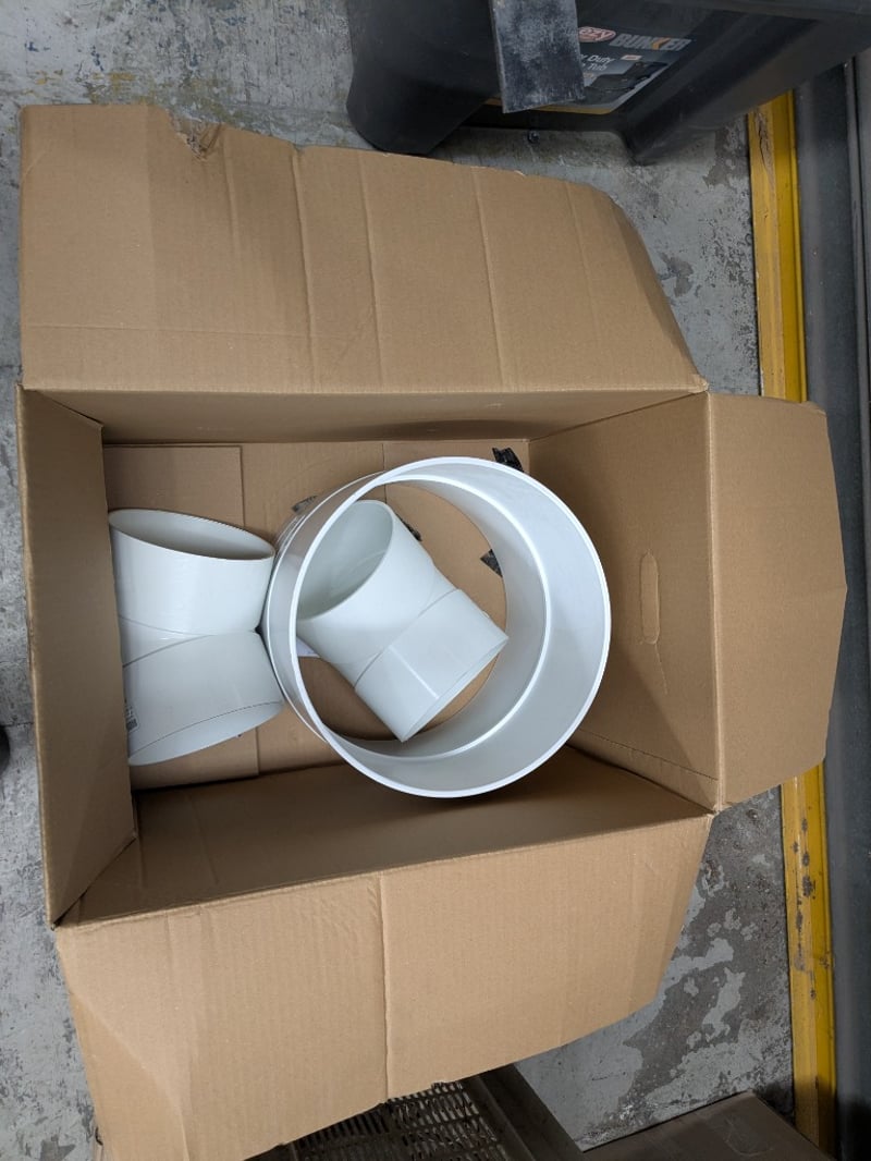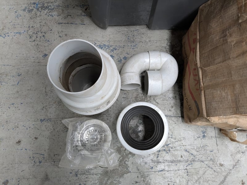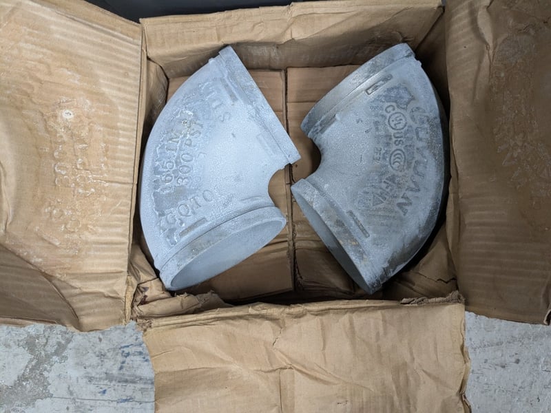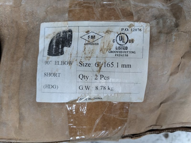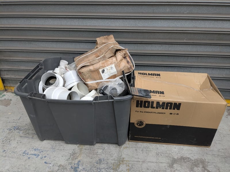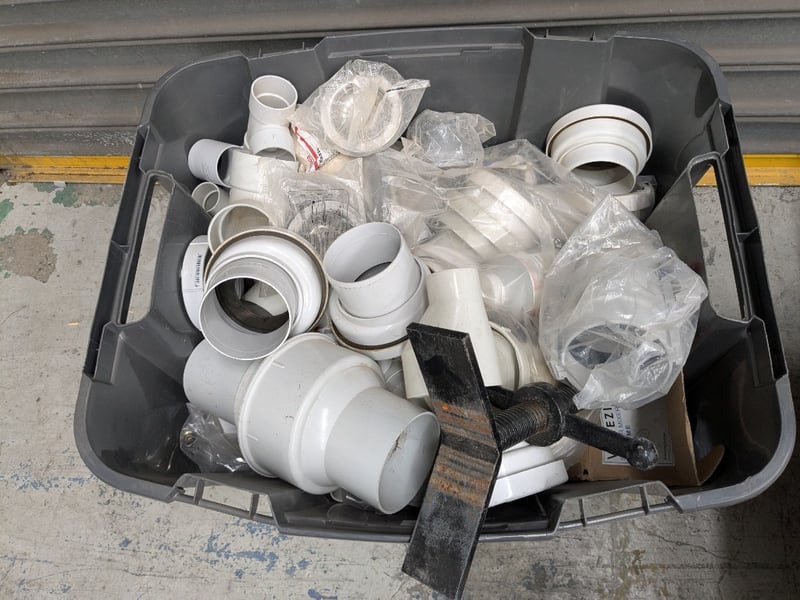 Assorted Plumbing supplies featuring Holman Pipe King and more brands, includes white PVC pipes and fittings of various sizes, 90-degree elbows (6"/165.1mm short pattern, grooved fitting FXZ6539, white PVC connectors, adapters, and coupling fittings. Additional items include plastic pipe sleeves, black rubber seals/gaskets, brass fittings, and miscellaneous plumbing hardware. Items includes both packaged and loose components in various diameters and configurations.Sold as lot