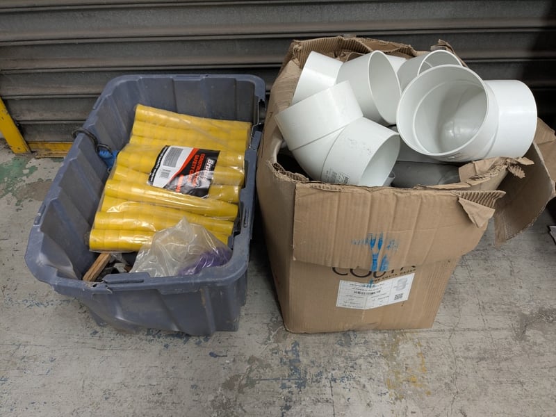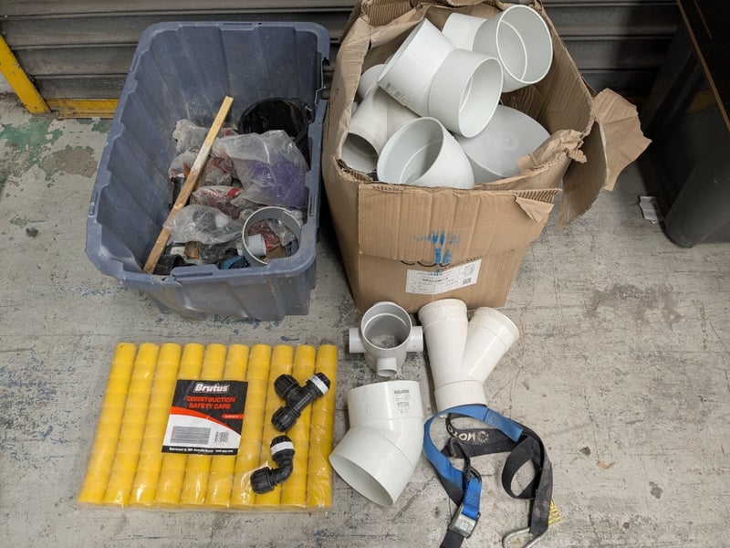 Mixed lot plumbing and construction supplies. Contents includes PVC fittings different types and brands, Brutus plastic safety caps ratchet and straps and moreSold as lot