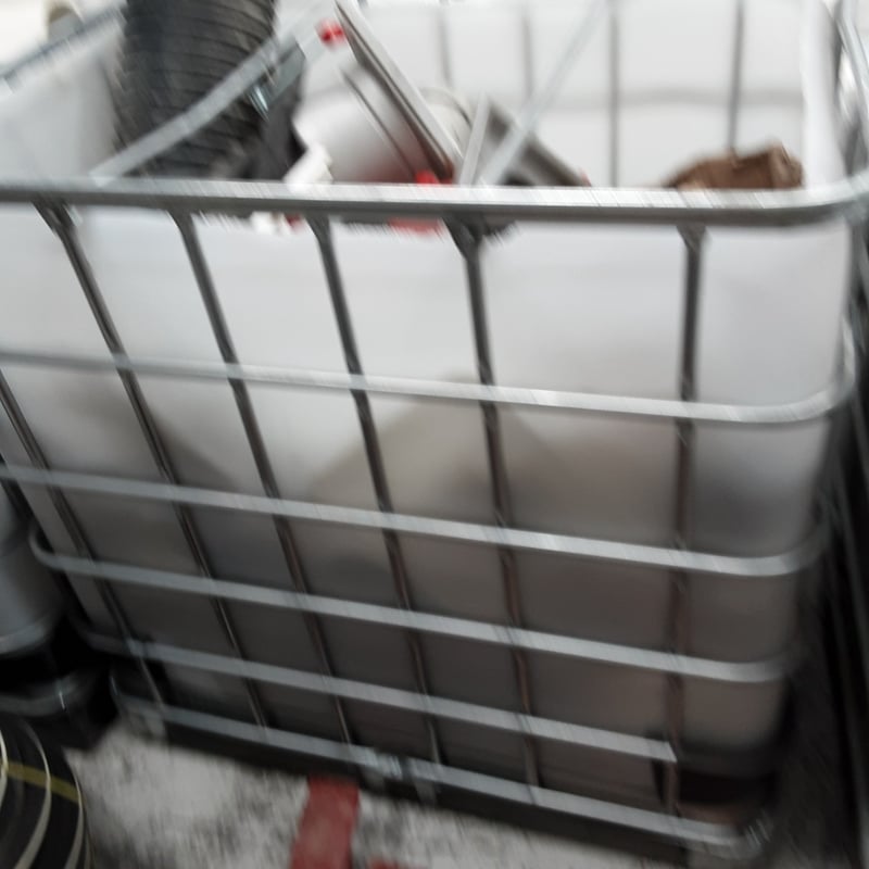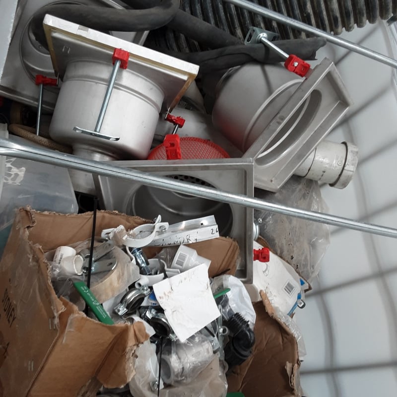Mixed lot of industrial items including a metal wire storage basket containing various assorted plumbing fixtures, connectors, valves, and hardware components. The collection features PVC pipes, brass fittings, ball valves, and various plumbing accessories. suitable for plumbing projects or maintenance work.