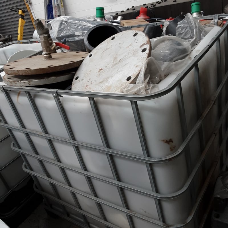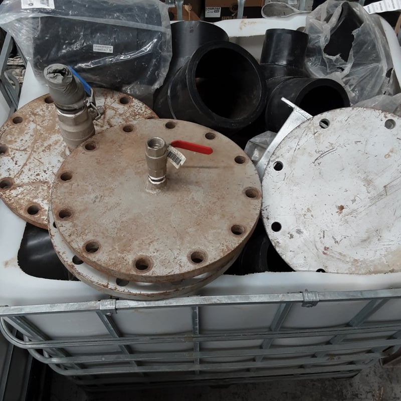 Industrial lot comprising pressure vessel components and flanged pipe fittings. Includes multiple flanged steel plates with bolt holes (various sizes, some rusted), black HDPE/PVC piping sections, metal nozzles with clamps, and miscellaneous industrial hardware. Suitable for manufacturing, plumbing, or industrial applications. Mixed condition with visible oxidation on metal components.
