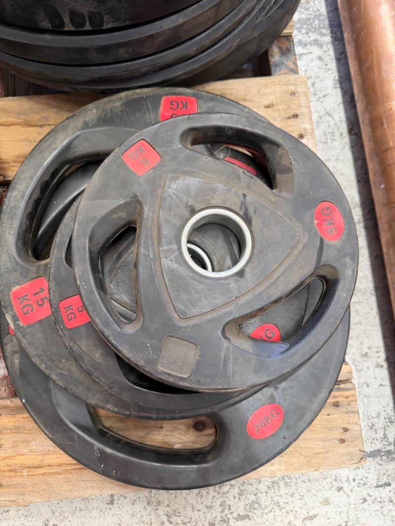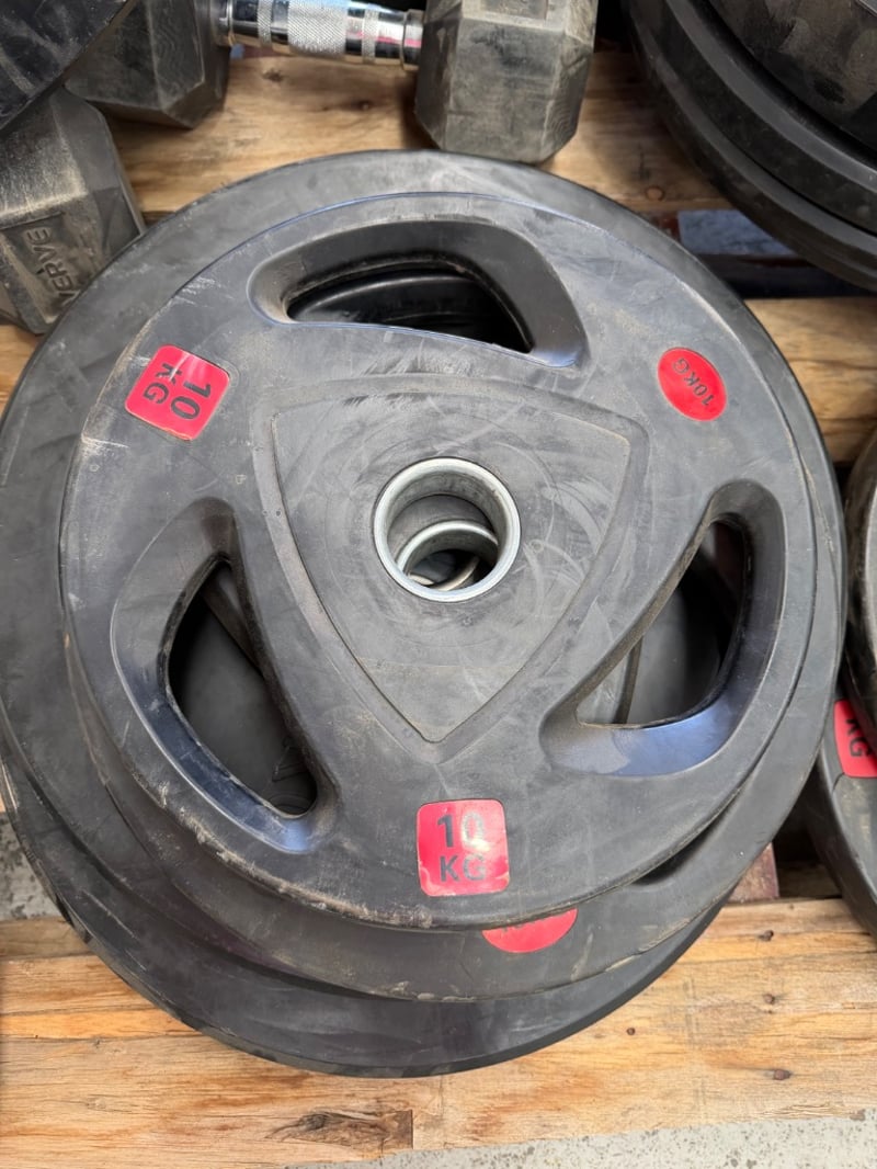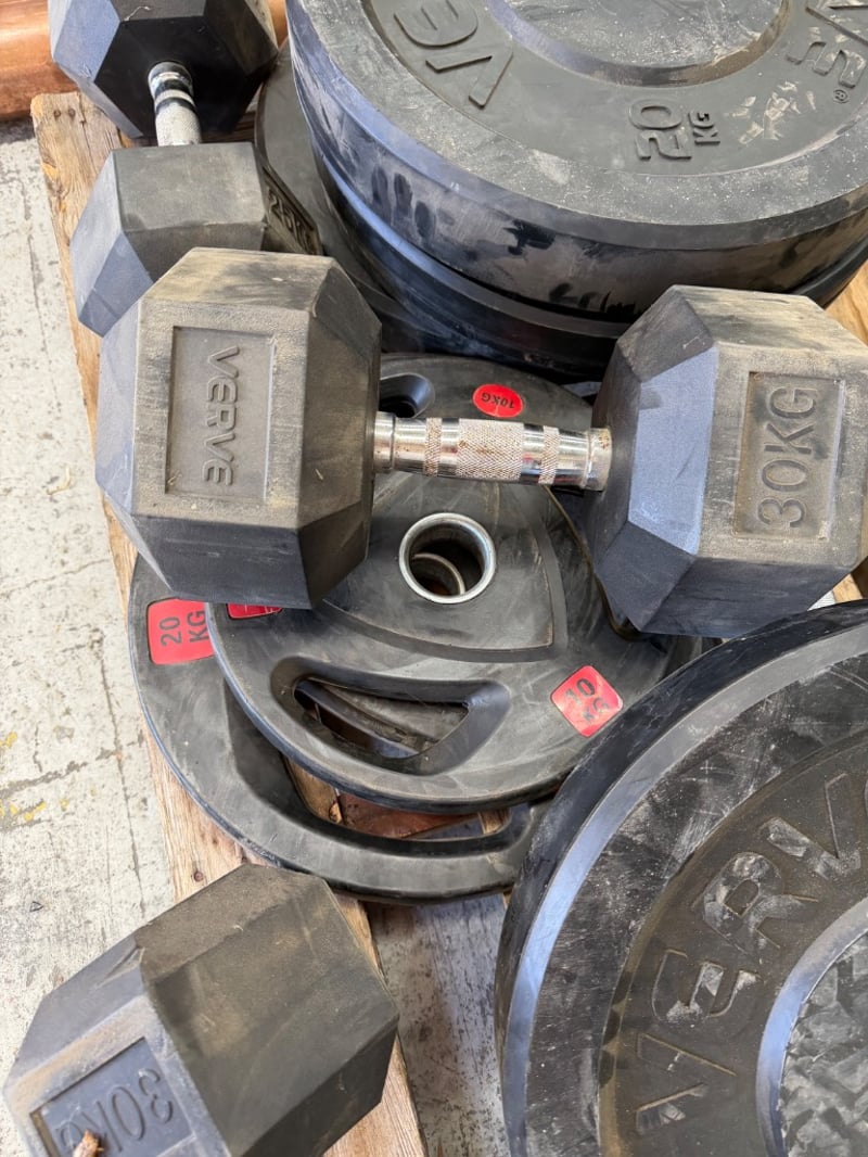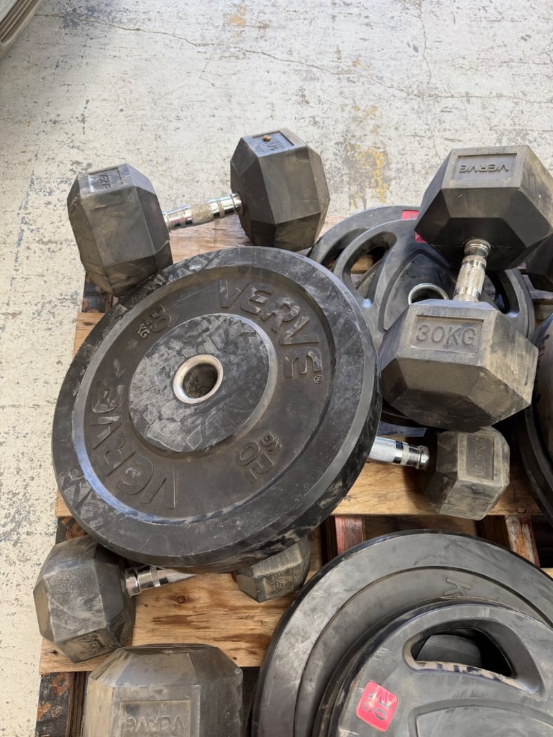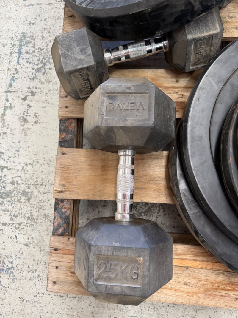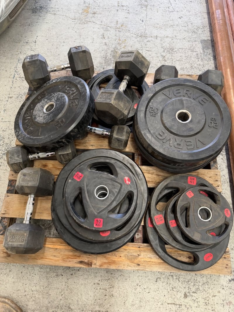 Comprehensive dumbbell and weight plate set featuring rubber-coated equipment suitable for home or commercial gym use. Set includes multiple rubber-coated weight plates with grip handles in various denominations (10kg, 15kg, 20kg visible), branded "VERVE" dumbbells in 25kg and 30kg configurations, and additional hex dumbbells. Plates feature color-coded red weight indicators for easy identification. Ideal for strength training, CrossFit, or gym facility setup.