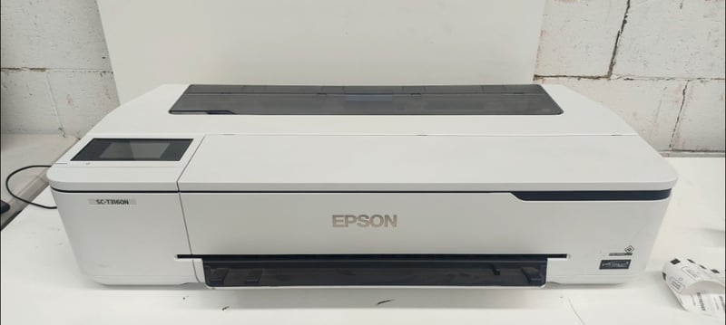 Epson SC-T3160N large-format printer in white finish. This professional-grade inkjet printer features a compact footprint suitable for technical drawing, CAD applications, and document reproduction. The unit includes a control panel with LCD display on the left side, a paper feed mechanism, and output tray. The printer shows visible dust accumulation and minor surface marks consistent with office use. Includes power cable. Ideal for architectural firms, engineering departments, or print shops requiring reliable wide-format printing capabilities.