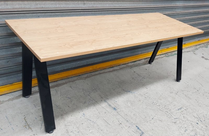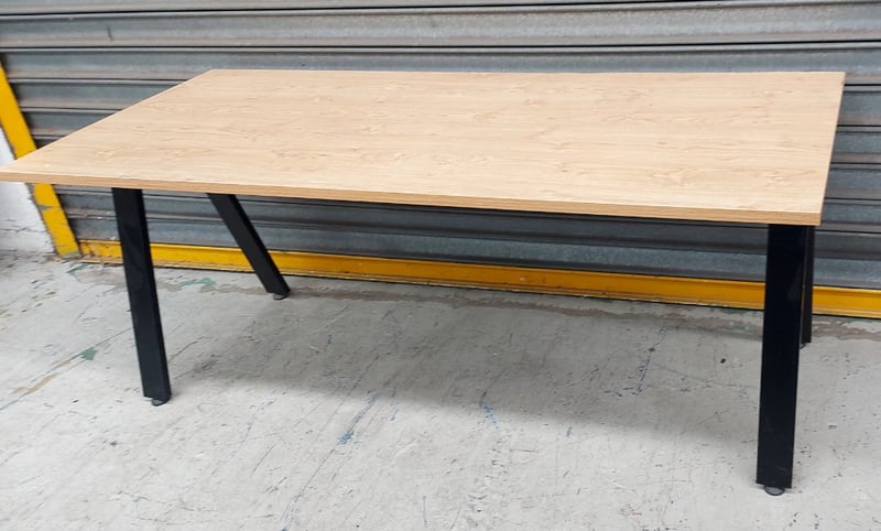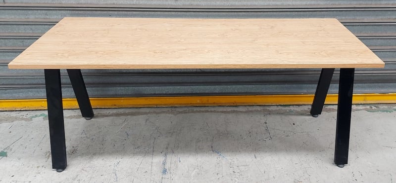 Modern dining table featuring a light natural timber top with a clean, contemporary design. The table showcases a rectangular plywood or engineered wood surface in a pale ash or birch finish, supported by four cylindrical black powder-coated steel legs. The minimalist aesthetic combines functionality with industrial-style elements, making it suitable for residential or commercial dining spaces. The table displays excellent craftsmanship with clean lines and a sturdy construction. Ideal for casual dining, meetings, or collaborative workspaces.