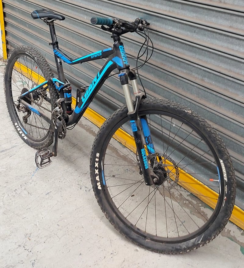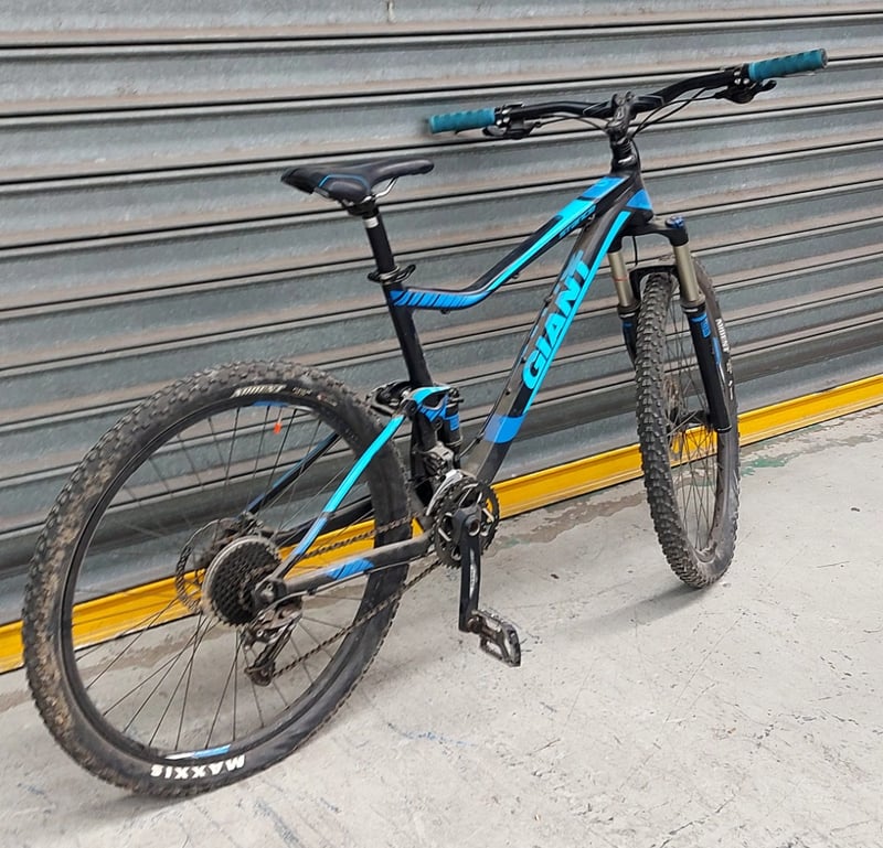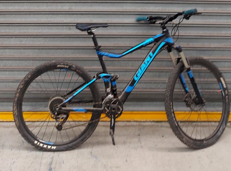 Dual-suspension mountain bike featuring a striking blue and black frame with grey accents. The bike showcases a full-suspension design with front fork and rear shock absorption, ideal for trail riding and off-road terrain. Equipped with Maxxis branded tyres, mechanical disc brakes on both wheels, and a multi-speed drivetrain with visible chainrings and derailleur system. The handlebars feature blue grip wraps and are fitted with brake levers and shifters. The saddle is black with a comfortable contoured design. Frame appears to be aluminium construction with clean welds. Pedals are platform-style. Overall presentation suggests a well-maintained recreational or intermediate-level mountain bike suitable for weekend trail adventures and general off-road cycling.
