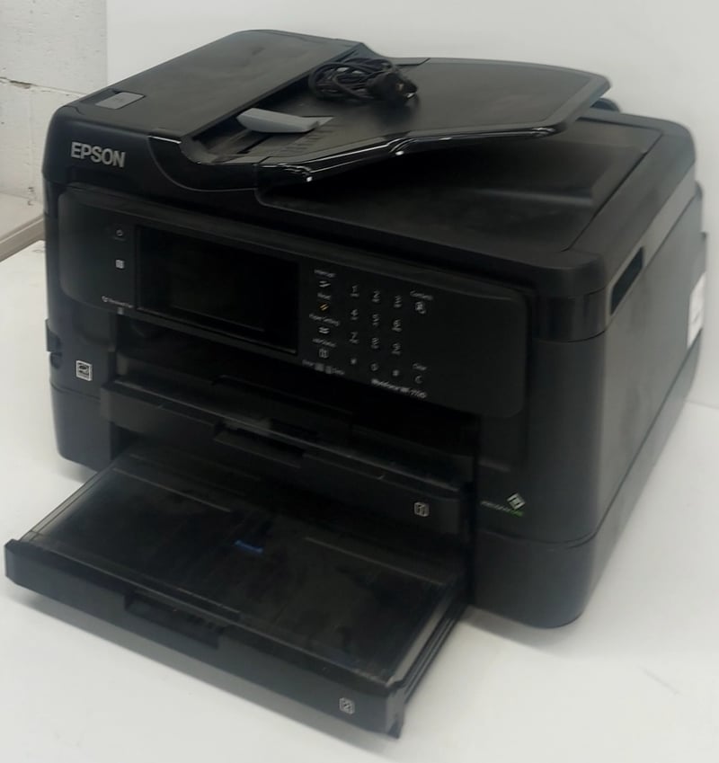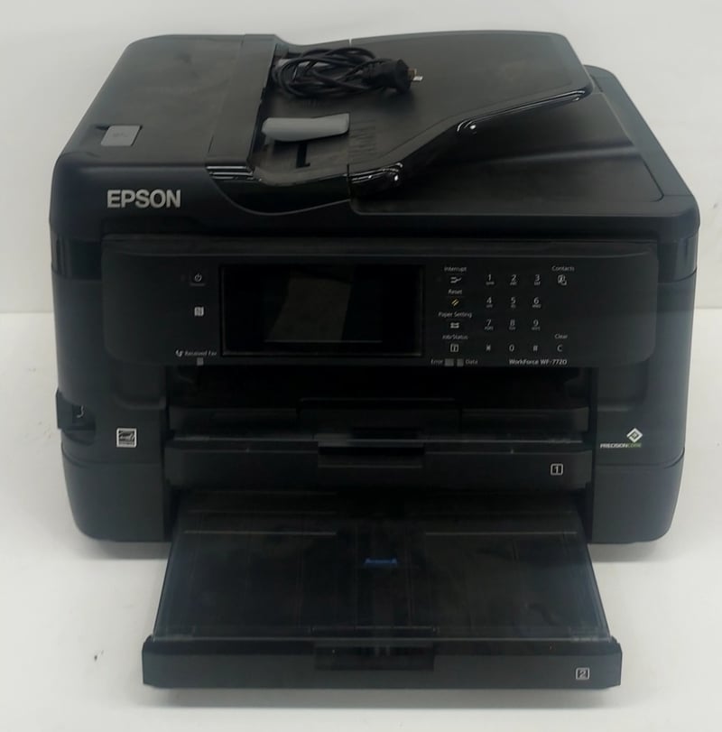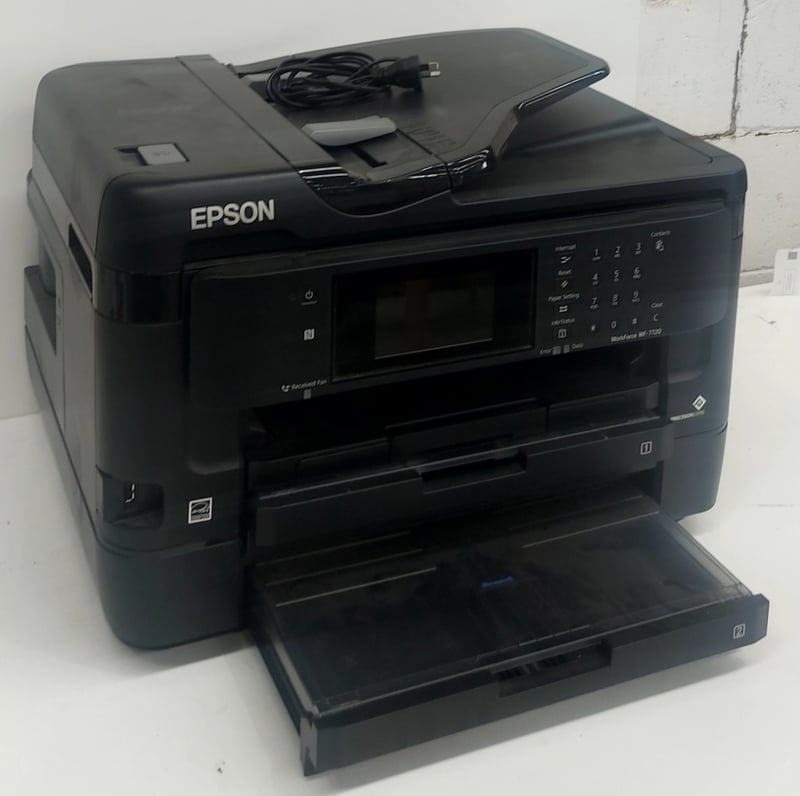 Epson WorkForce WF-7720 multifunction inkjet printer. Black compact design with automatic document feeder (ADF) on top. Features integrated fax, copy, scan, and print capabilities. LCD display panel with numeric keypad for contacts and settings. Paper tray visible at base. Includes power cable. This is a business-class all-in-one device suitable for small office or workgroup environments, offering wireless connectivity and high-volume document handling.