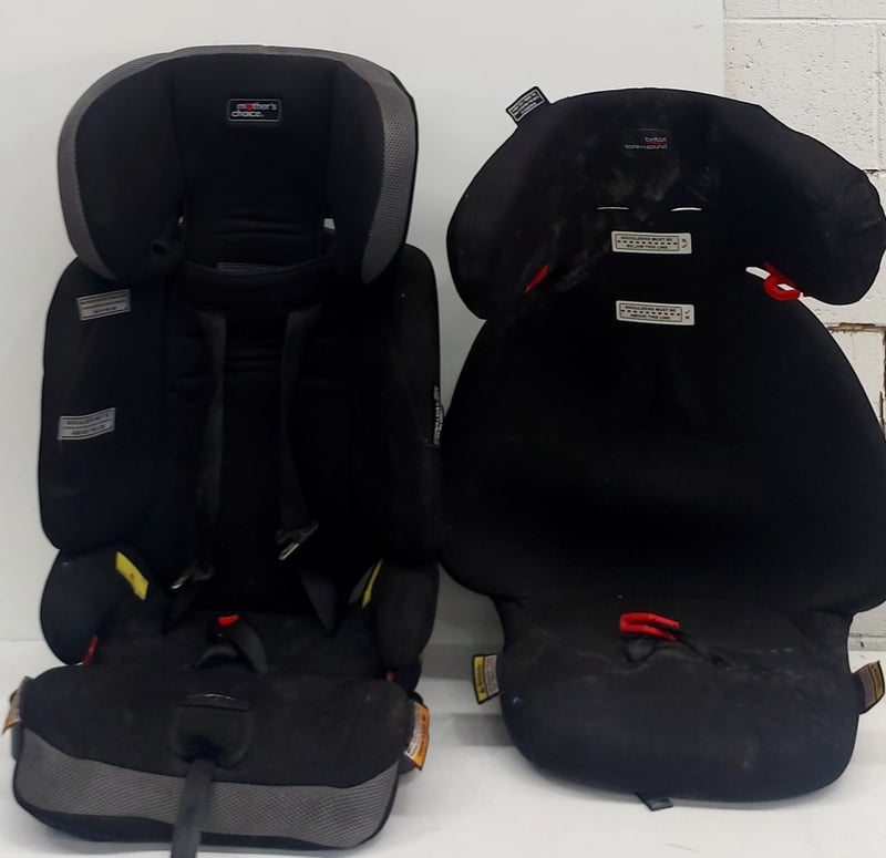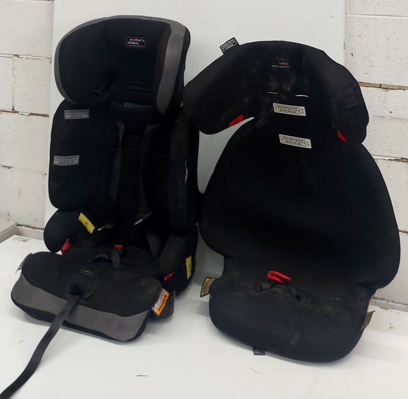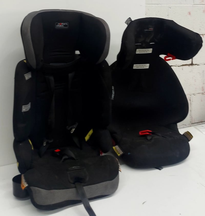 Pair of black child car seats featuring convertible booster designs. Left seat displays gray mesh side panels with integrated harness system, multiple safety labels, and yellow/red adjustment straps. Right seat is full black with dual safety certification labels visible on back, red harness components, and orange base trim. Both seats feature padded construction, recline functionality indicators, and carry handles. Seats show signs of use with visible wear on fabric surfaces. Suitable for growing children with adjustable configurations. Includes all visible safety documentation and labeling intact.