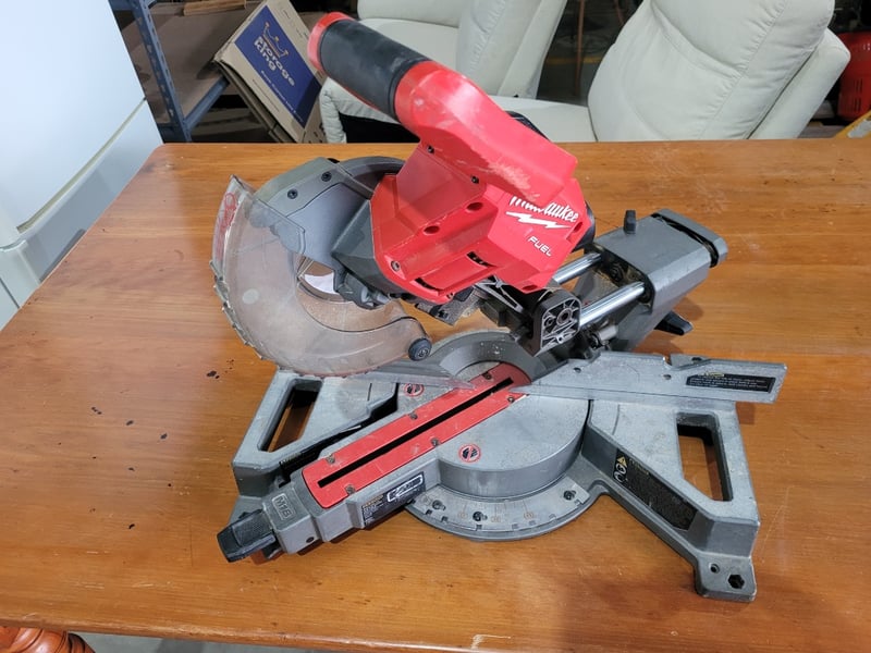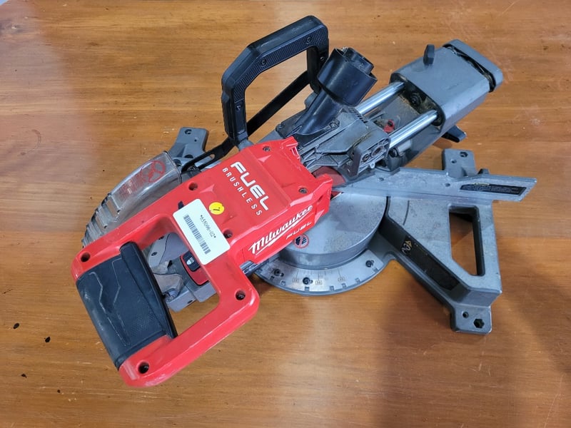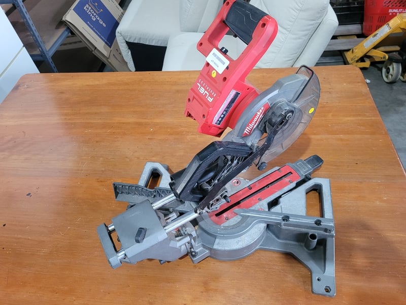 Milwaukee Drop Saw Description: Battery Drop saw, brushless. Note: Unknown working condition, no battery, no blade, used, marks and wear.