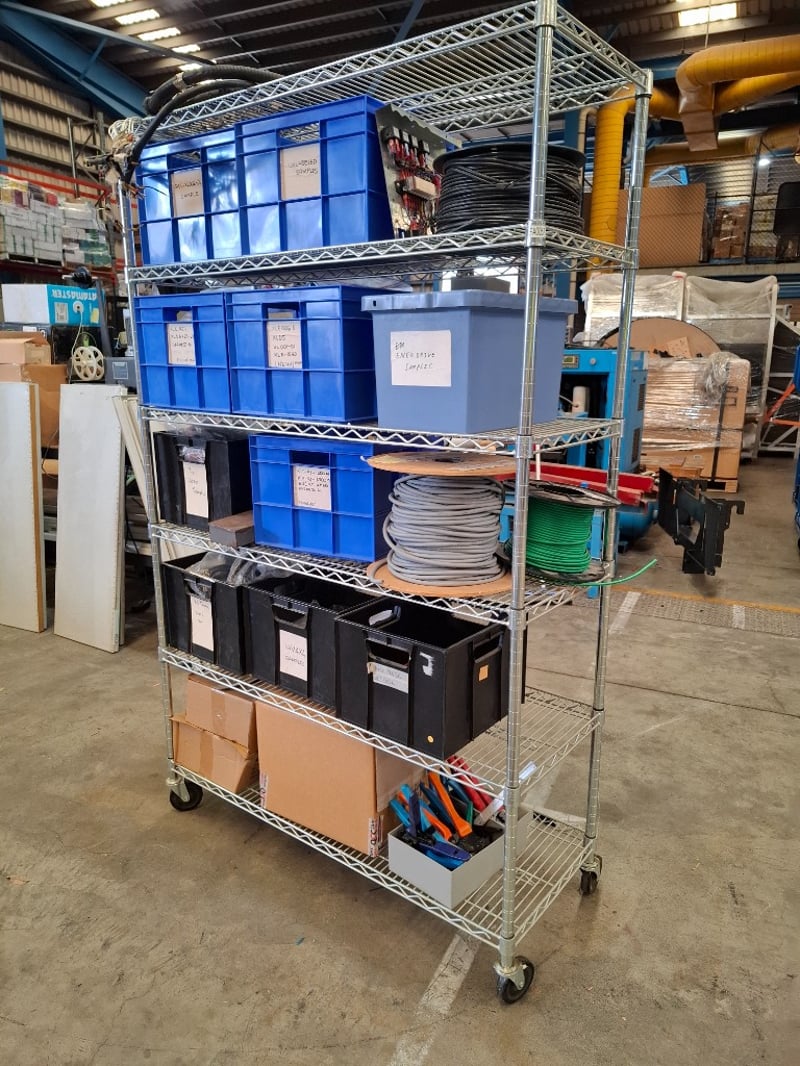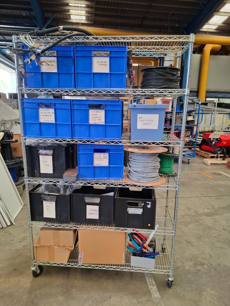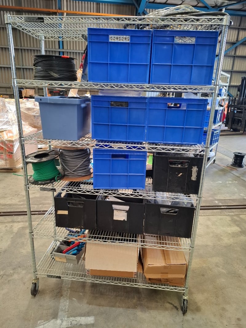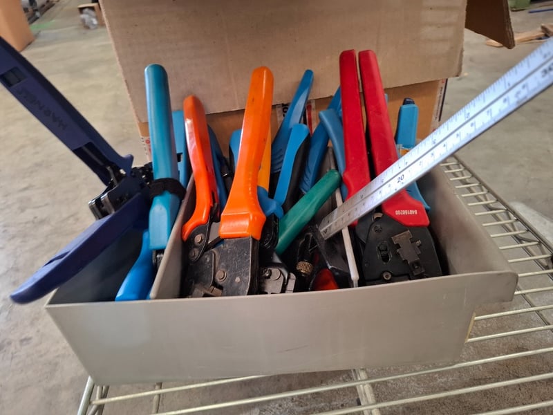 Assorted Electric Components, Includes Rack, Wire Crimpers, Wiring Harnesses, Various Cable and more, Quantity to Rack