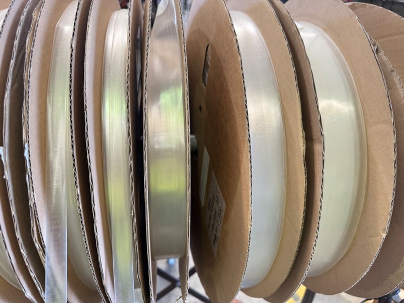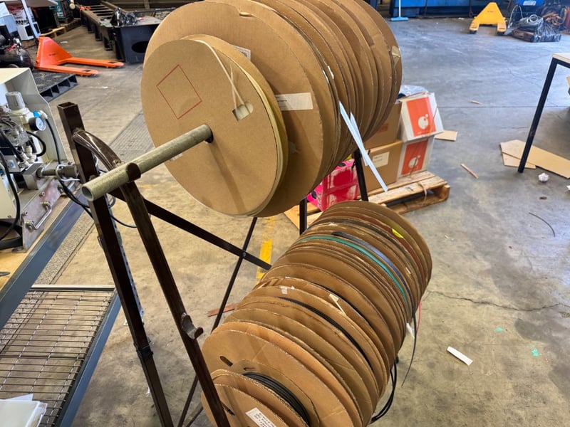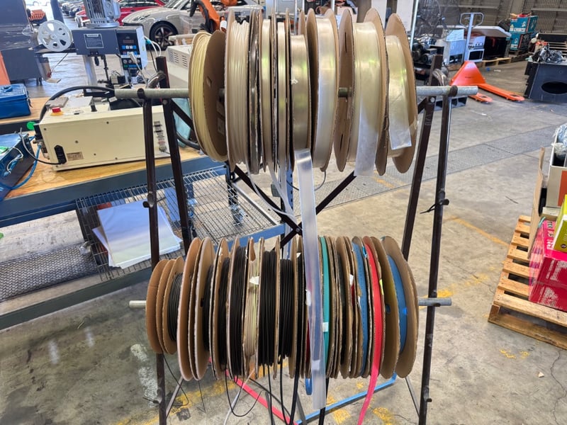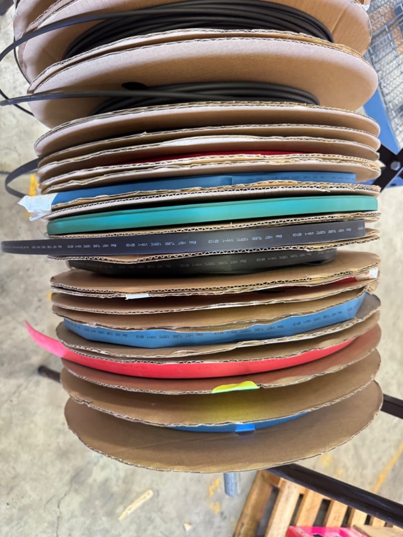 Assorted rack of wiring tube rolls various sizing and types Note: sold as lot